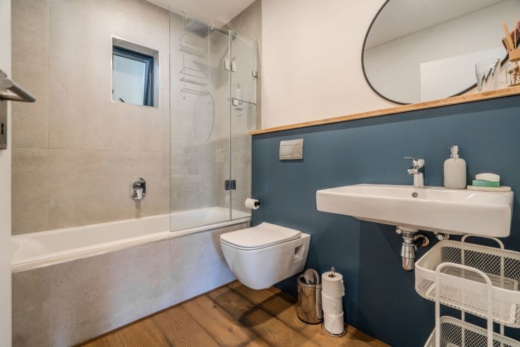 Inside, modern design meets timeless quality. The sleek kitchen is crafted with Caeserstone countertops and fitted with a premium SMEG gas and electric cooker, making it a perfect space for culinary inspiration. An open-plan layout connects seamlessly to the living and dining areas, where the natural light flows effortlessly through floor-to-ceiling glass, highlighting the careful finishes and spacious design.