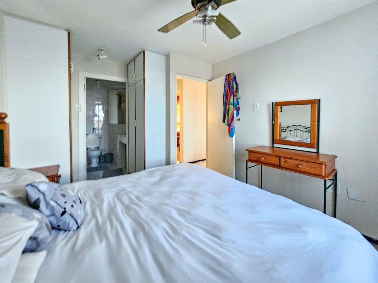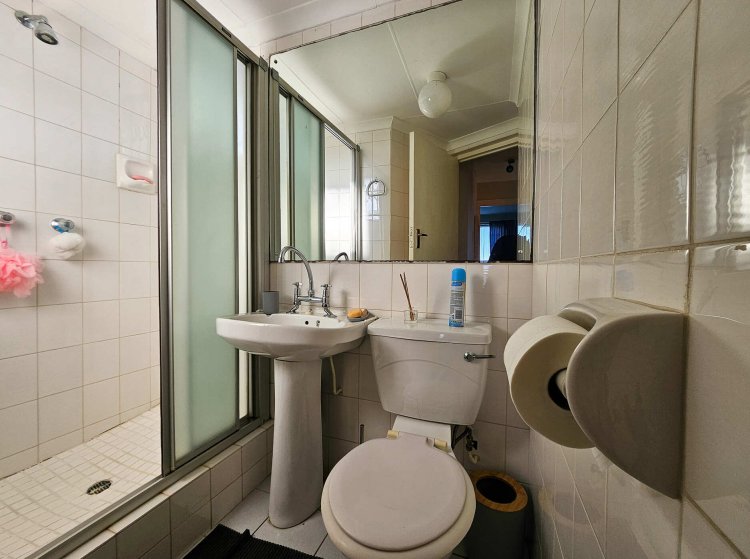 The unit includes two bedrooms with built-in wardrobes and two full bathrooms—one with a shower and a master ensuite equipped with both a bath and showerhead. The property has predominantly tiled flooring, with comfortable carpeting in the bedrooms.