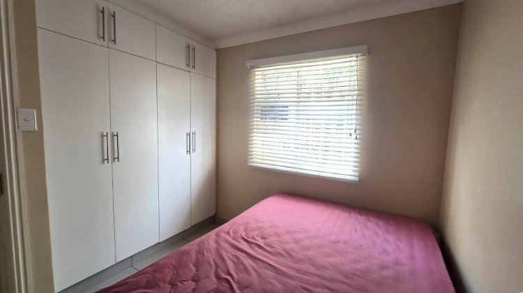 Lockup garage with shelves for extra storage. Burglar bars, trellidors, aluminium mosquito screens and air conditioner.