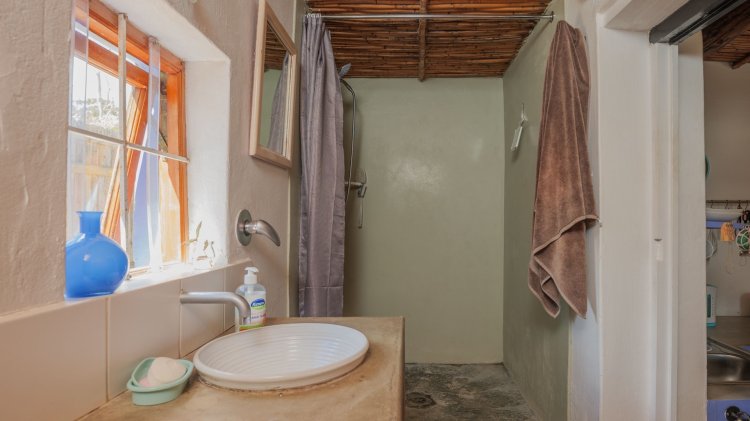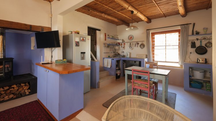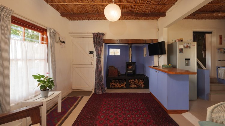 The home features a cosy living area with a fireplace, an open-plan kitchen, modern bathroom and two spacious and airy bedrooms. Original wooden doors, thick walls, and high ceilings speak to the home’s heritage.