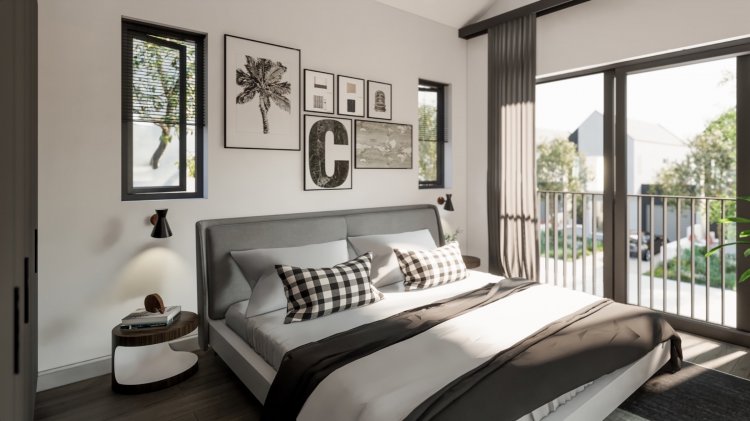 Designed with effortless entertaining in mind, this home features an open-plan kitchen that flows seamlessly into the living area and out onto a covered braai patio, ideal for year-round indoor-outdoor living. The well-proportioned bedrooms offer built-in cupboards and impressive double-volume pitched ceilings, enhancing the sense of space. Each bedroom features its own Juliet balcony with sliding doors, inviting in fresh breezes and natural light for year-round comfort.