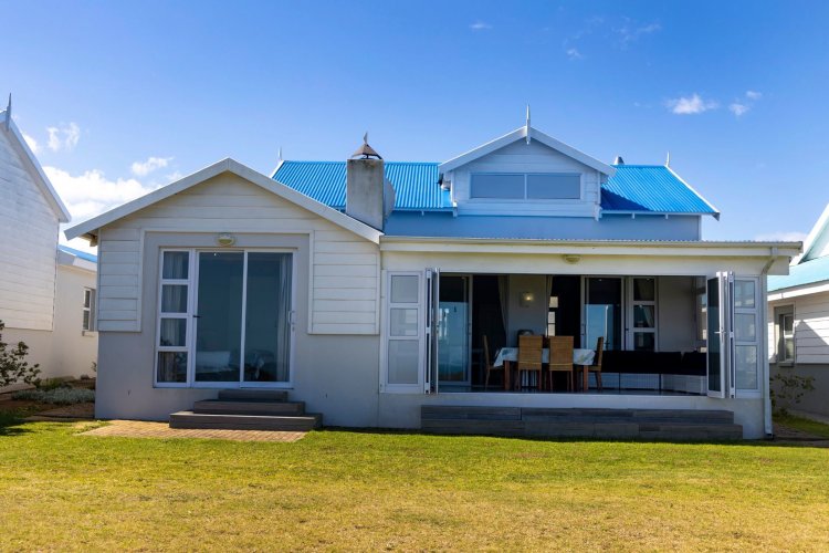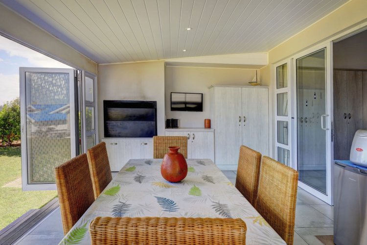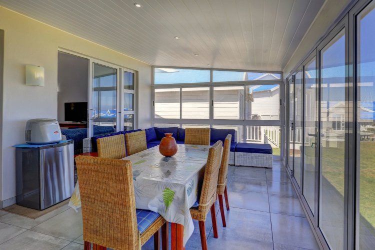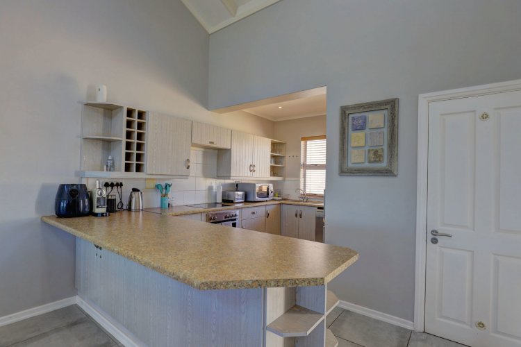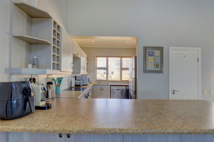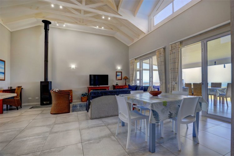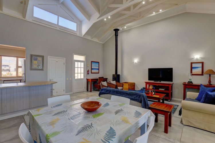 Designed for both comfort and style, the home features an open-plan living area with exposed beams, double-volume ceilings, a fireplace, and built-in cupboards. Stacking doors open from the indoor braai area, blending indoor and outdoor living.