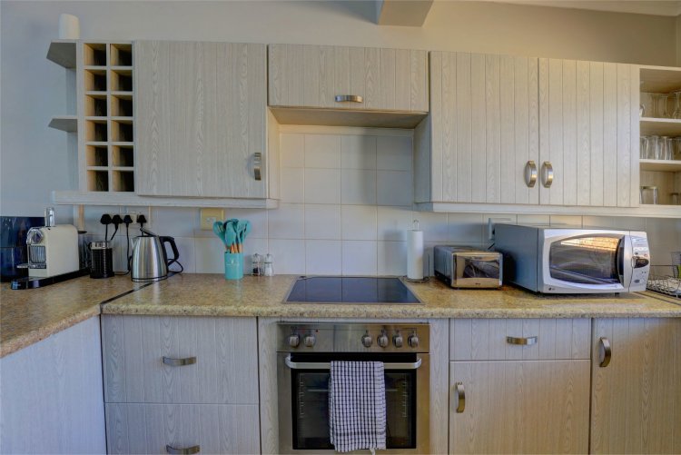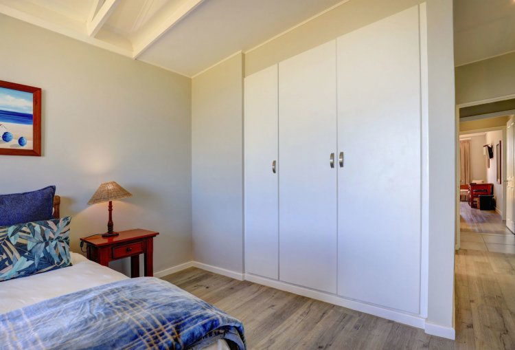 The kitchen includes a separate storage room for practicality. Both bedrooms are en suite with sliding doors; one frames the sweeping coastal views, while the other enjoys warm northern sunlight.