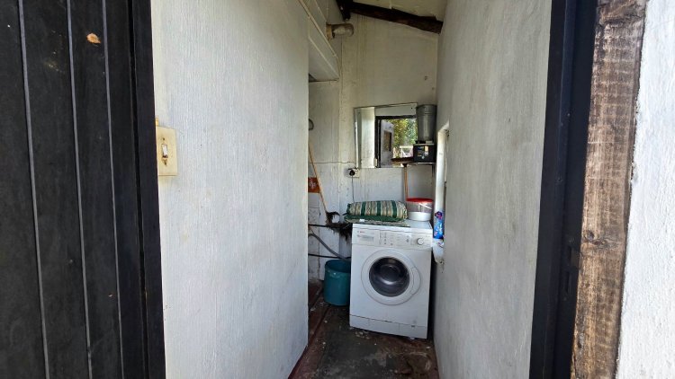 Additional features include a tiled-roof structure, plastered walls, aluminium windows, and a practical laundry area with concrete finishes and washing machine connection.
