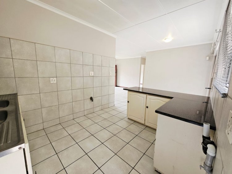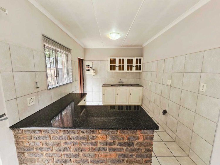 The spacious open-plan lounge and dining area flows out to a private courtyard featuring a built-in braai—perfect for relaxed entertaining. The fitted kitchen boasts granite countertops and ample cupboard space. Leading from the kitchen is a second enclosed courtyard with a washing line, adding to the home’s practicality.