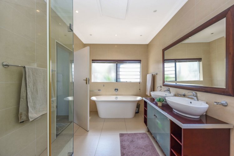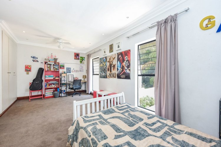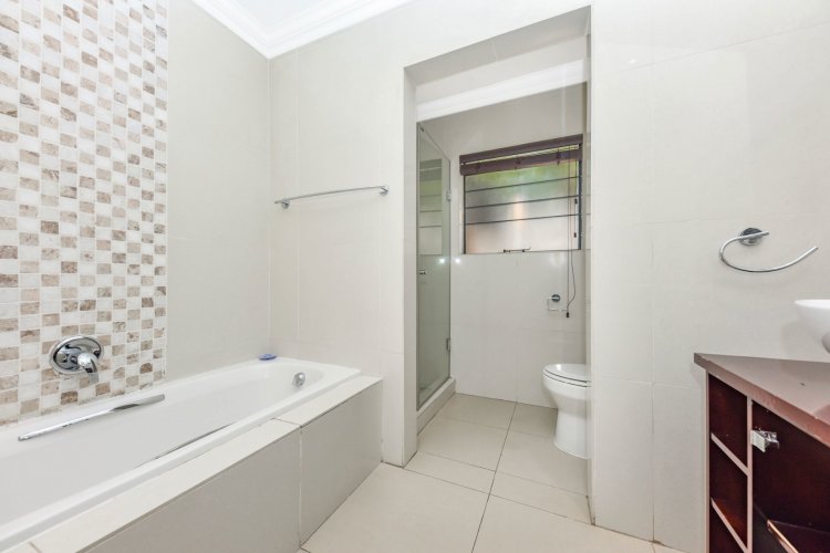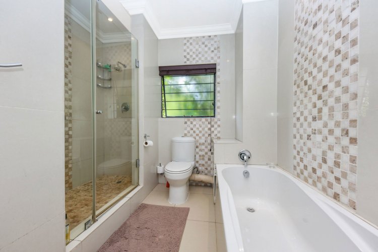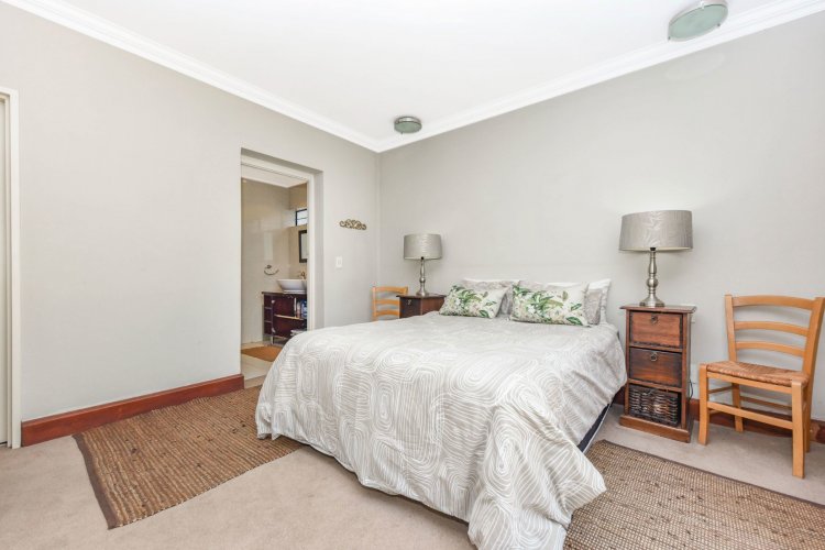 The downstairs bedroom offers a full en-suite bathroom and built-in cupboards. Upstairs, the main suite impresses with a walk-in closet, luxurious full bathroom with his and hers basins, air-conditioning, and generous cupboard space. The third bedroom is equally inviting, with abundant natural light, ample storage, and its own full bathroom.