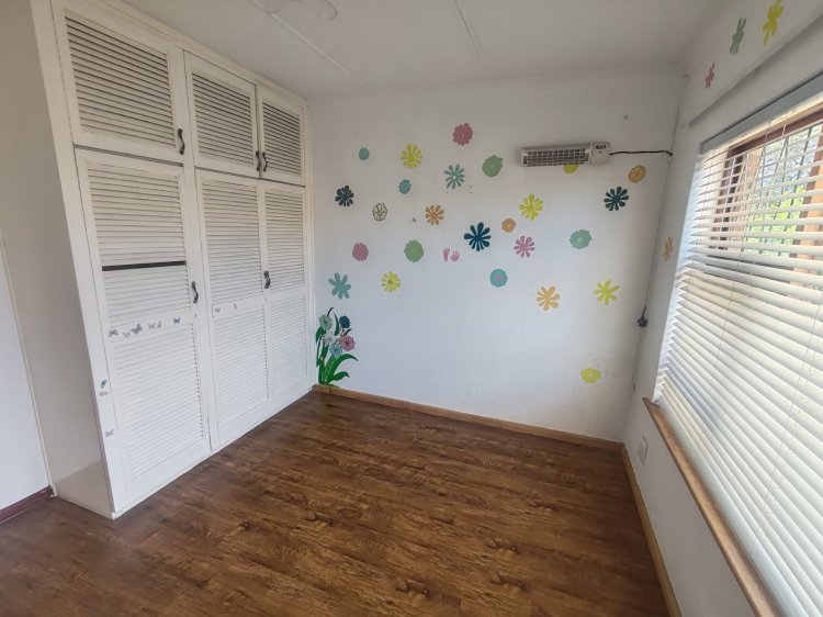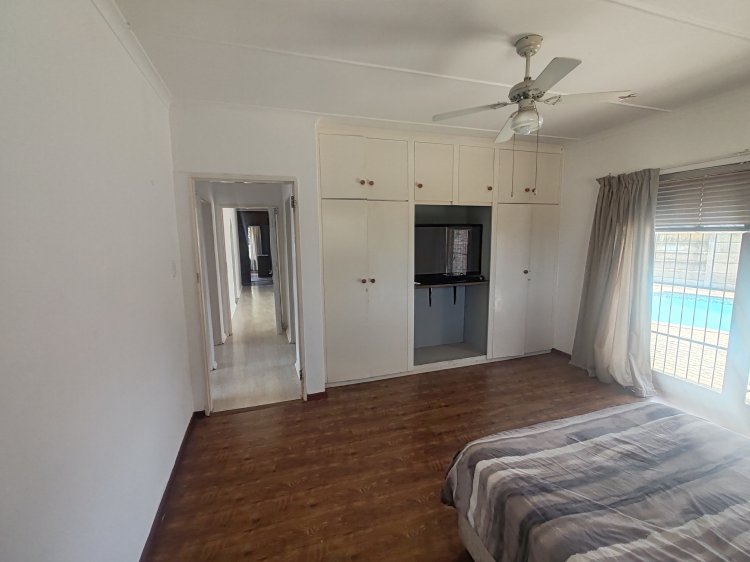 This home offers three well-sized bedrooms, all fitted with built-in cupboards. The main bedroom features a sliding door leading to the pool area, an air conditioner, and a private en-suite bathroom with shower, basin, and toilet. The main bathroom is fitted with a bath, toilet, and basin.