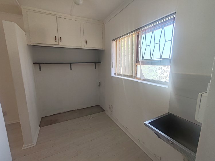 The spacious kitchen is fitted with ample cupboards, an eye-level oven, hob, and includes a conveniently placed laundry area.