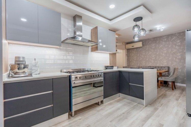 Kitchen has Caesarstone waterfall countertops, gas hob, sleek cabinetry, and ambient designer lighting.