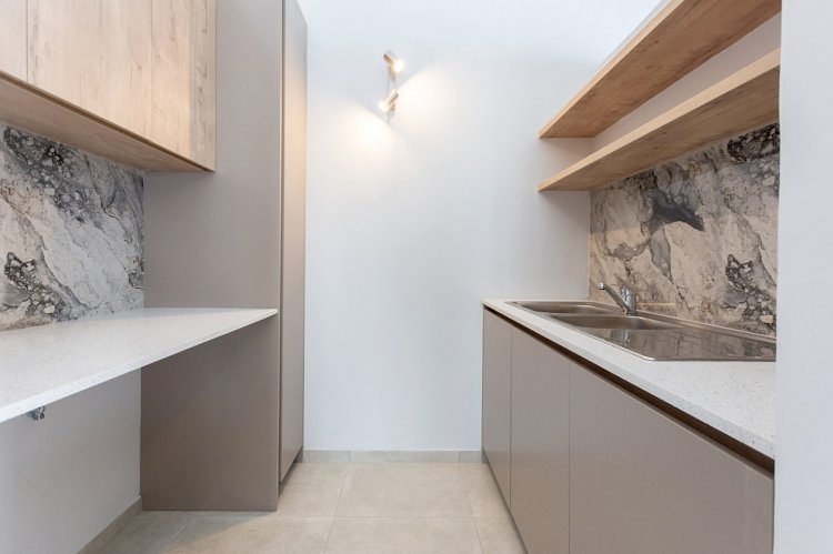 The contemporary kitchen boasts sleek countertops and ample cabinetry making it a joy to prepare meals and gather with loved ones. Cupboard designed for a 9-liter gas bottle