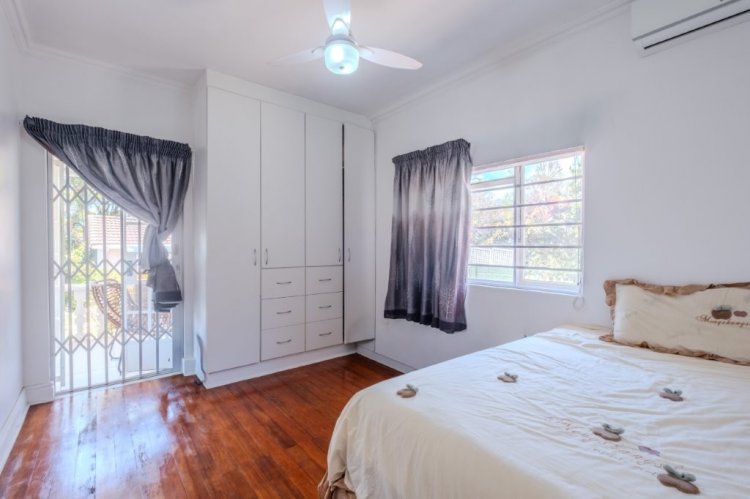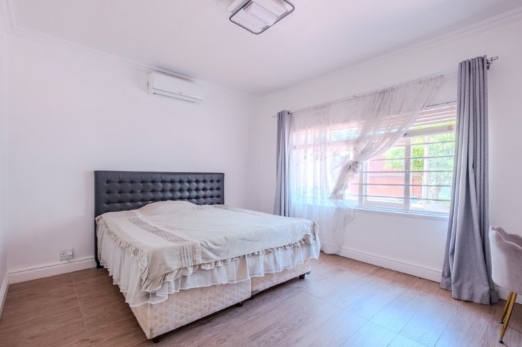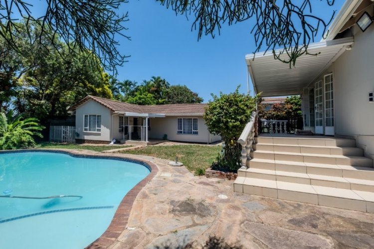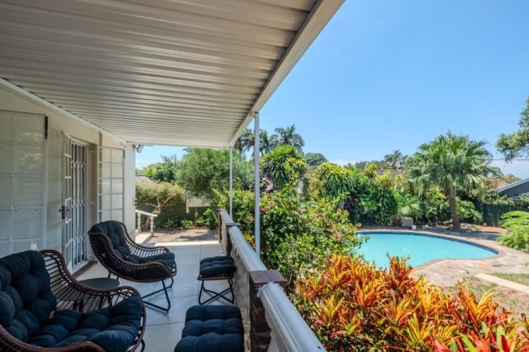 Situated on one of Durban North’s most sought after roads, this large free standing home offers the rare advantage of completely level land throughout the property. Secure and well positioned, the home provides ample parking for up to six vehicles behind automated gates and is fitted with CCTV cameras for added peace of mind. Perfectly located, this home is centrally positioned close to some of Durban North’s best schools, from pre primary through to high school. Enjoy easy access to main transport routes, as well as a variety of shops and popular restaurants just minutes away. Upon entering, you are welcomed by high ceilings and a bright, open-plan living and dining area filled with natural light. The home is fully tiled throughout and features a spacious, separate kitchen fitted with ample cupboard and cabinet space, an electric stove and oven, and a dishwasher connection. Stacker doors lead from the kitchen to a covered entertainment area with space for a built in braai, overlooking the sparkling blue swimming pool, ideal for entertaining and enjoying Durban’s warm summer days.