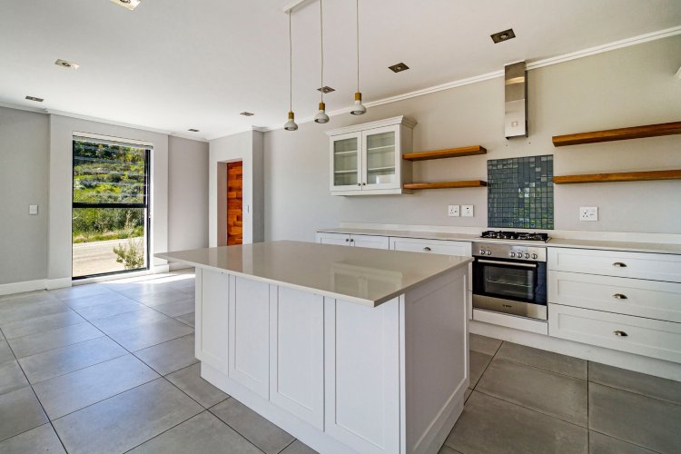 The open-plan living area is light-filled and spacious, with large stacking doors on three sides that seamlessly connect the indoors to the lush outdoors. A cozy fireplace anchors the living space, making it warm and inviting during the cooler months. The heart of the home is a charming country-style kitchen with a central island, free-standing gas hob and electric oven. A separate scullery provides ample space for appliances and direct access to the oversized double garage. A guest cloakroom is also conveniently located on the ground floor.
