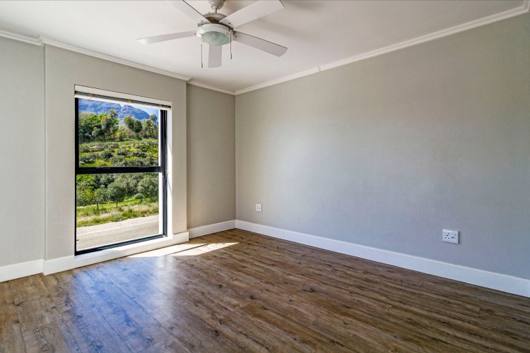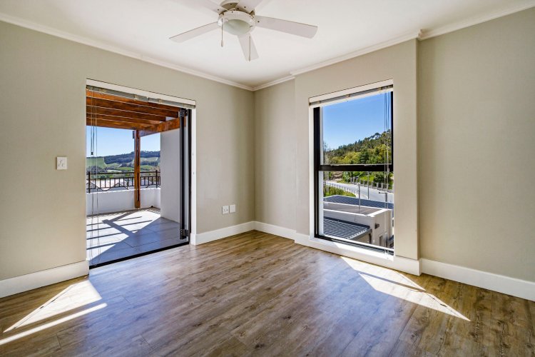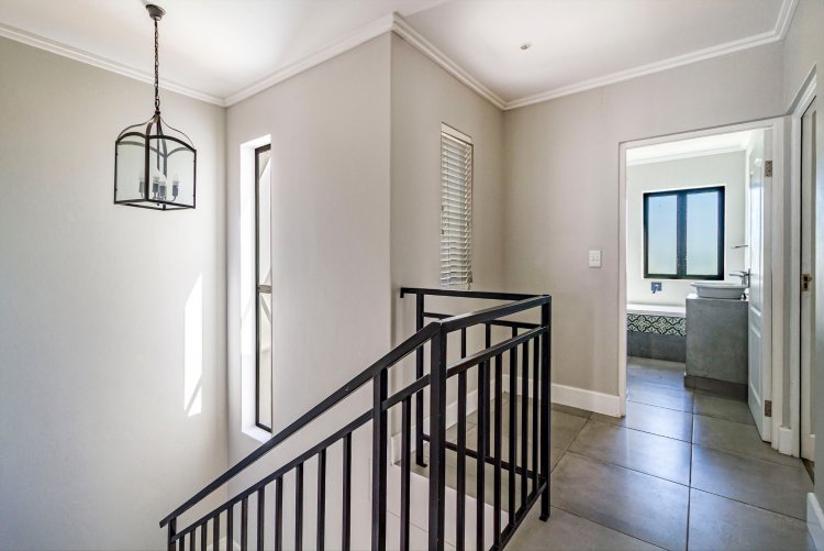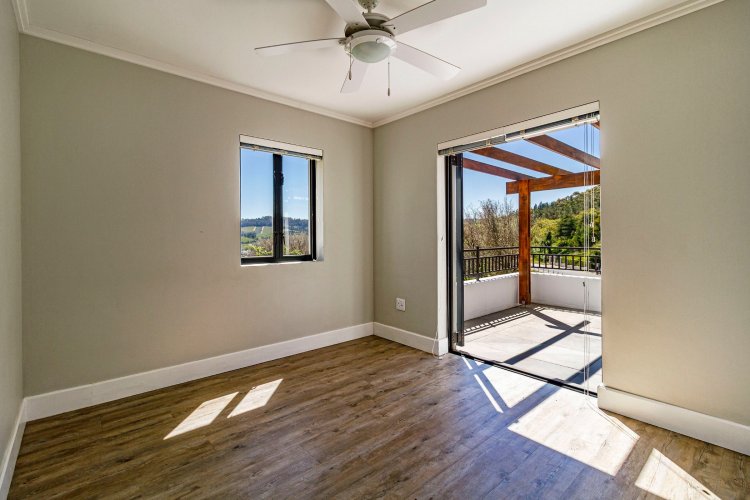 Upstairs, the home continues to impress. The main bedroom offers breathtaking vineyard views, a luxurious en-suite bathroom with double vanities, and exceptional storage with nine built-in cupboards. Two additional bedrooms are generously sized, with one enjoying a private balcony overlooking the vineyards and the other offering views of Botmanskop. A full family bathroom is shared, and a light-filled landing creates the perfect space for a study nook or reading corner.