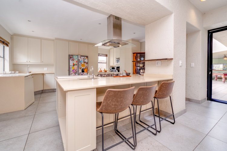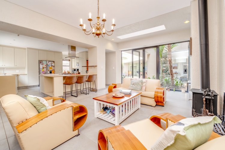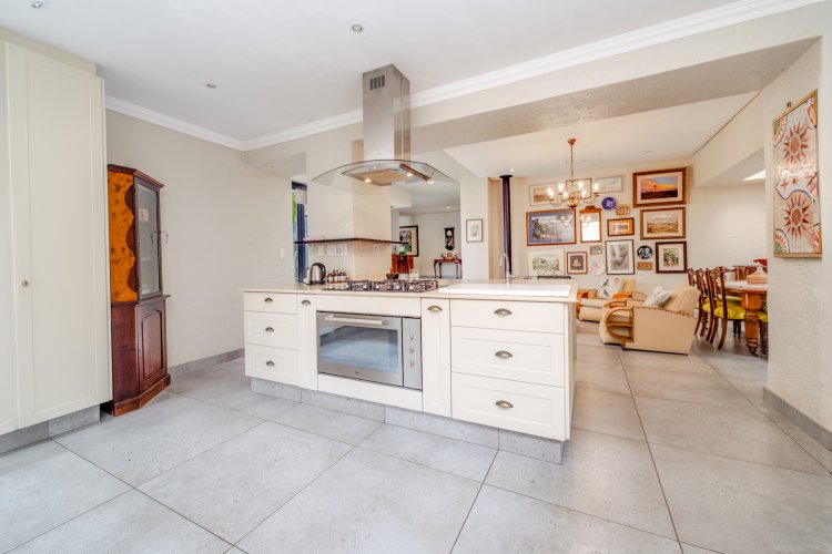 This open plan layout connects the informal lounge, intimate dining area and spacious Gourmet kitchen with sleek counter tops, quality Gas cooker, double fridge space and loads of cabinetry.