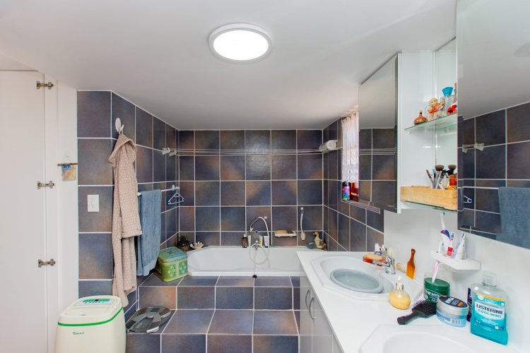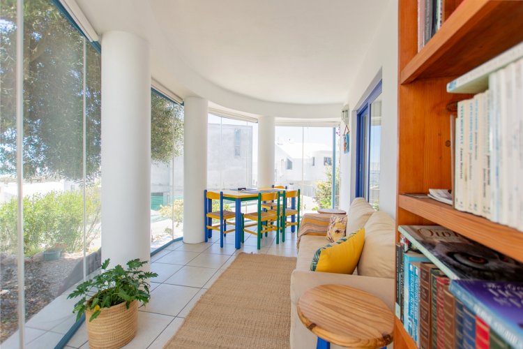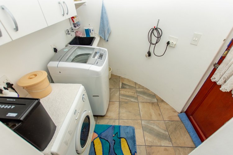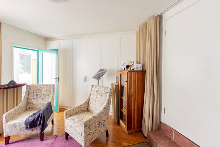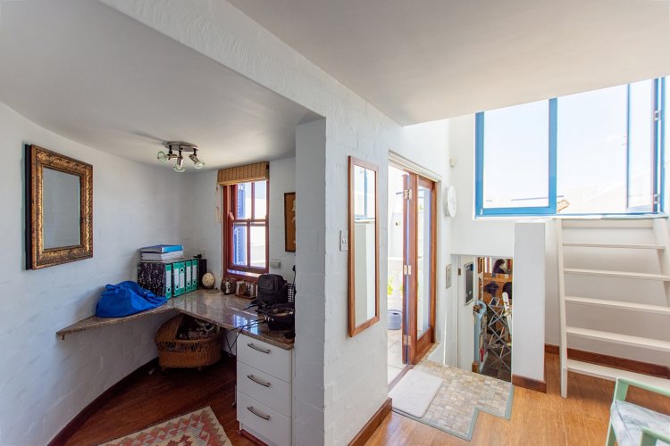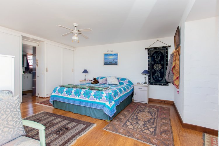 The main bedroom is generously sized, featuring bamboo flooring, abundant cupboard space, and a dedicated workspace—ideal for remote work. The en-suite bathroom includes his-and-hers basins, and the bedroom windows provide stunning sea views. A staircase leads to another patio with magnificent sea views, perfect for quiet contemplation.