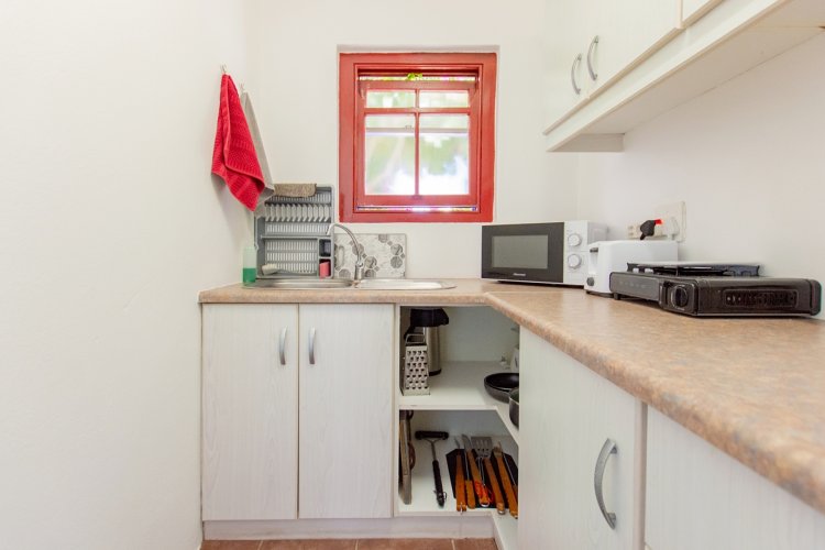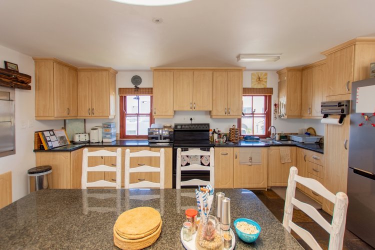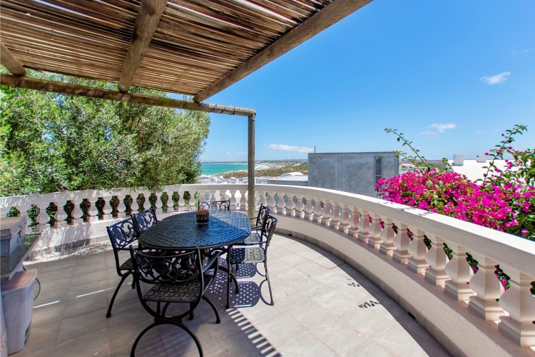 As you ascend the staircase, you enter an open-plan living area. To the right, you'll find a fully equipped kitchen complete with ample cupboards and a built-in braai. To the left is the inviting living space, featuring a cozy fireplace ideal for winter evenings. The living area seamlessly opens onto a large patio, offering breathtaking sea views—perfect for enjoying your morning coffee while listening to the waves.