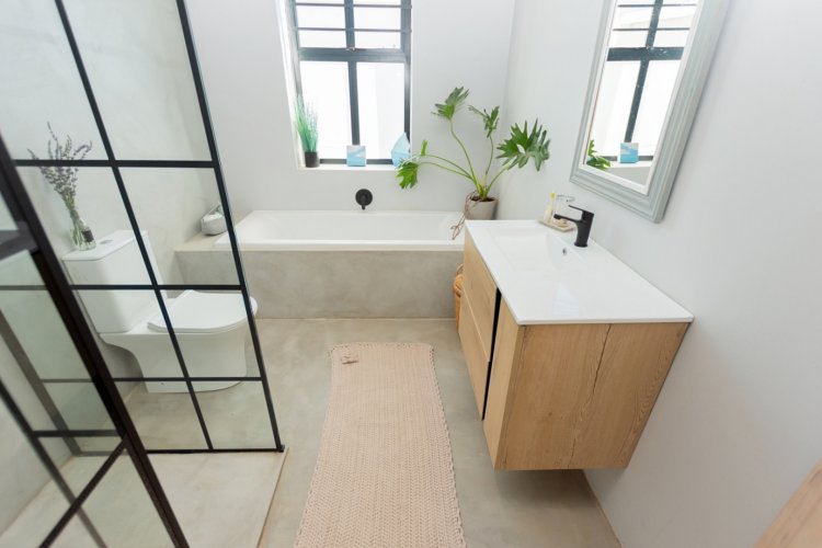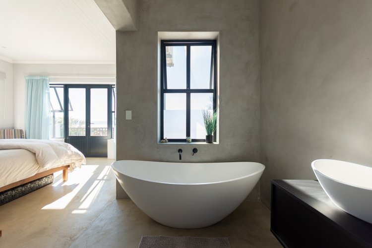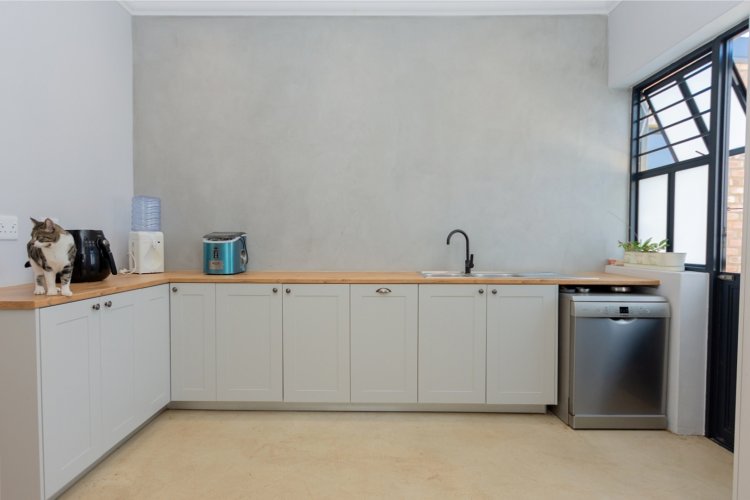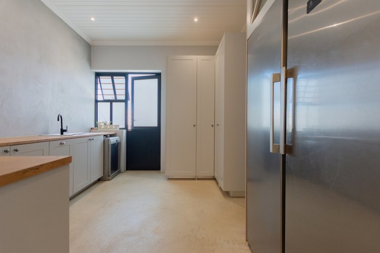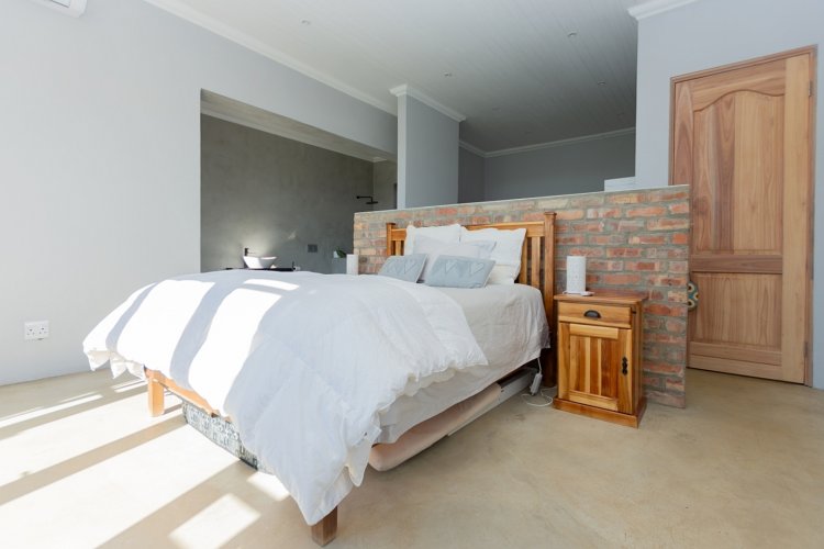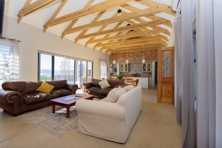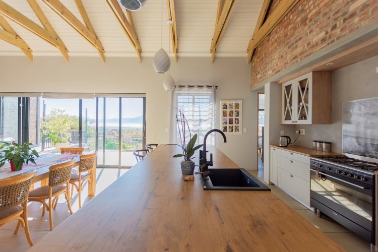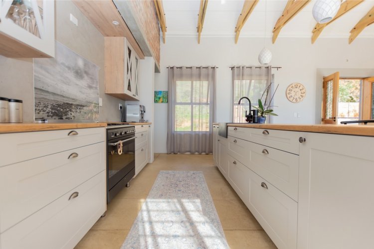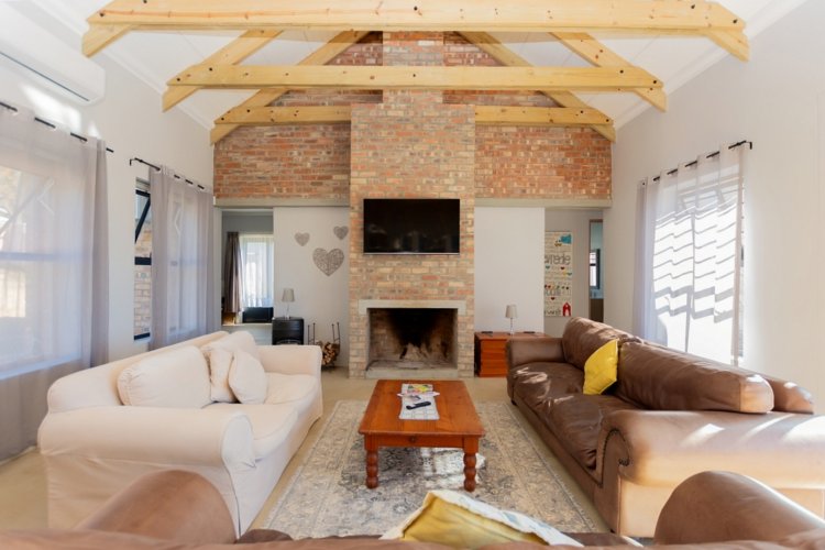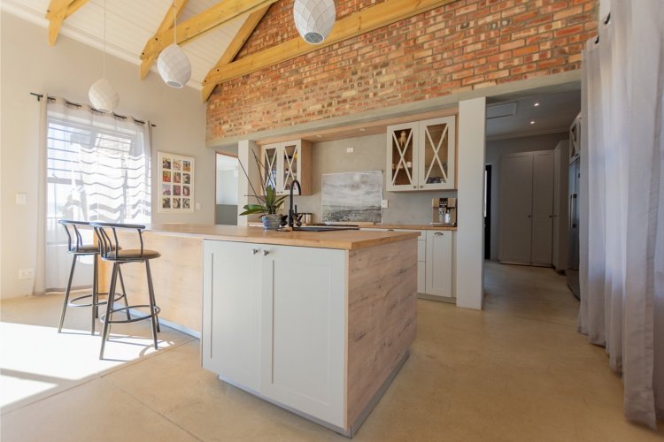At the heart of the home lies a sleek open-plan kitchen, designed for both functionality and style. A generous center island, granite sink, and quality finishes make it an entertainer’s delight. The adjoining dining and living areas flow seamlessly together, anchored by a cozy fireplace — perfect for relaxed evenings during Riebeek’s crisp winters. Expansive double-volume ceilings and sun-filtering blinds throughout enhance the home’s bright, spacious atmosphere, while the smooth screeded floors offer both durability and charm.