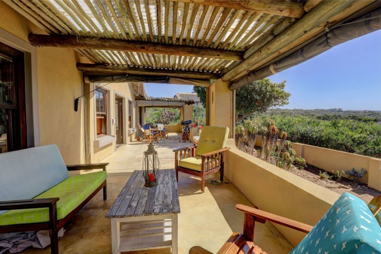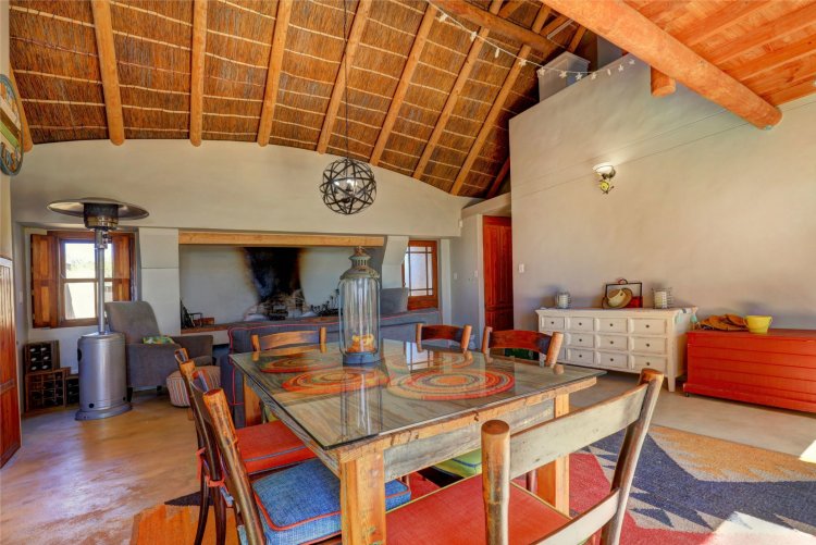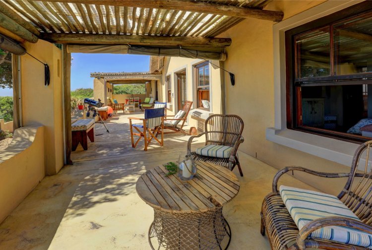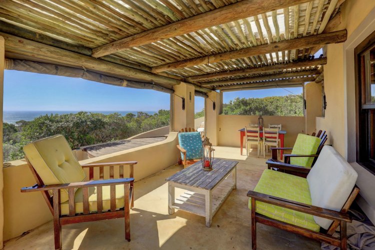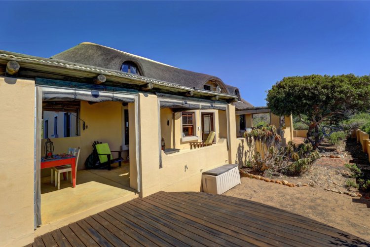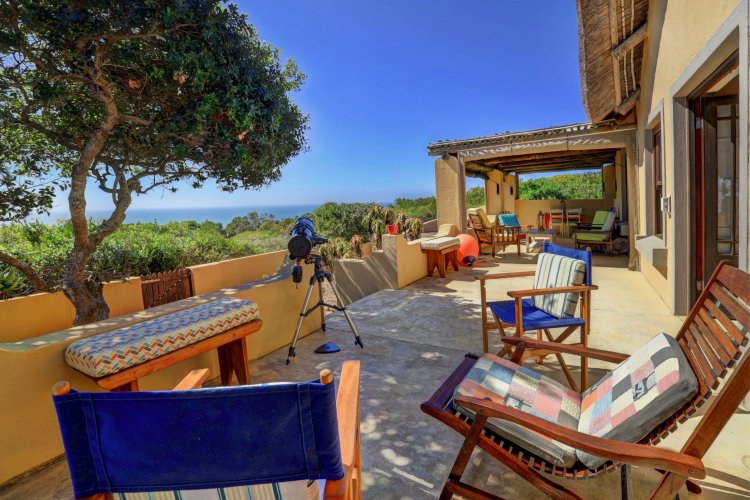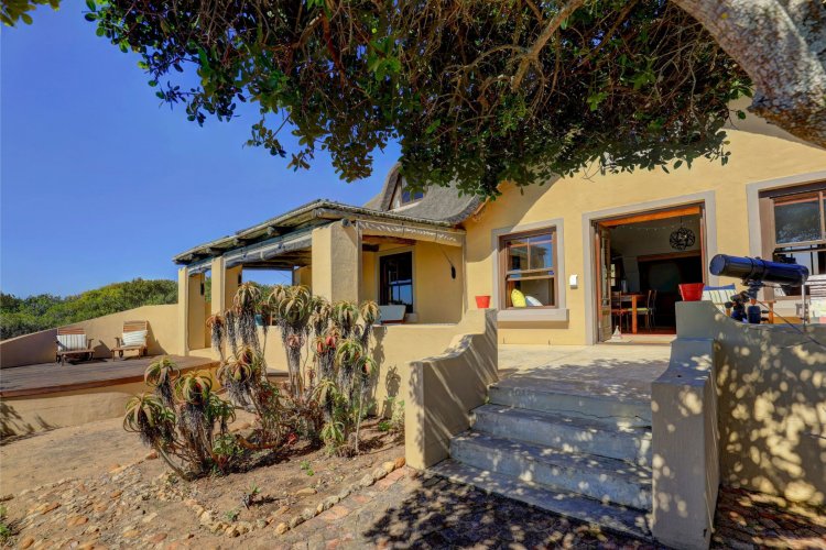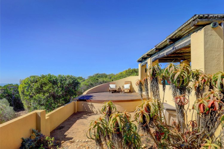 Glass doors open to a spacious covered deck that steps down to an open viewing area, both surrounded by lush fynbos and panoramic scenery — ideal for easy entertaining or quiet evenings beneath the stars.