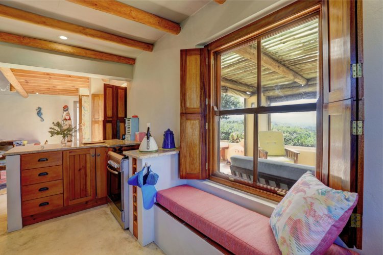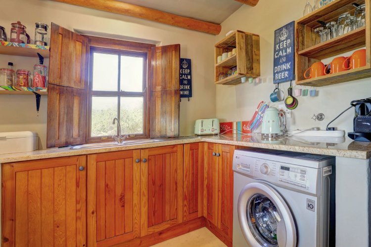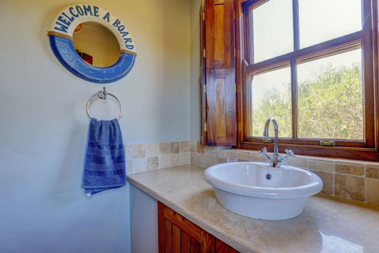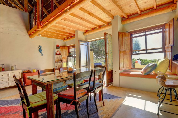 Inside, the home exudes warmth and character. The open-plan living and dining area centres around a striking fireplace, creating a space that feels both intimate and welcoming. A country-style kitchen complements the cottage aesthetic, while timber-framed sash windows with shutters frame sweeping ocean views and invite natural light throughout the space.