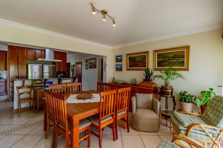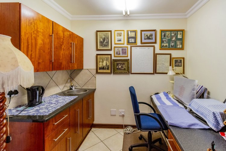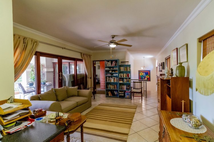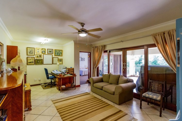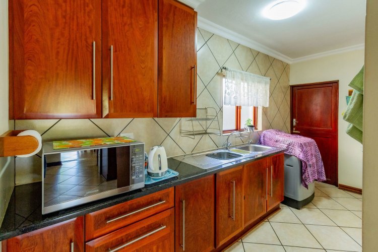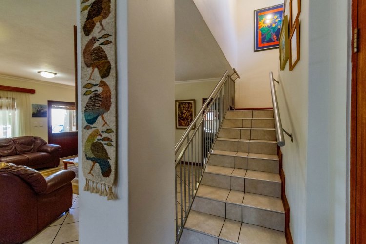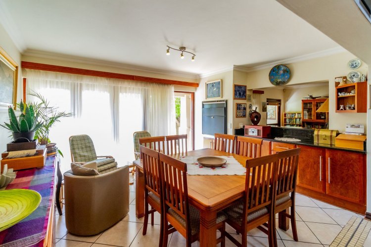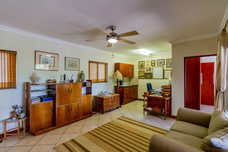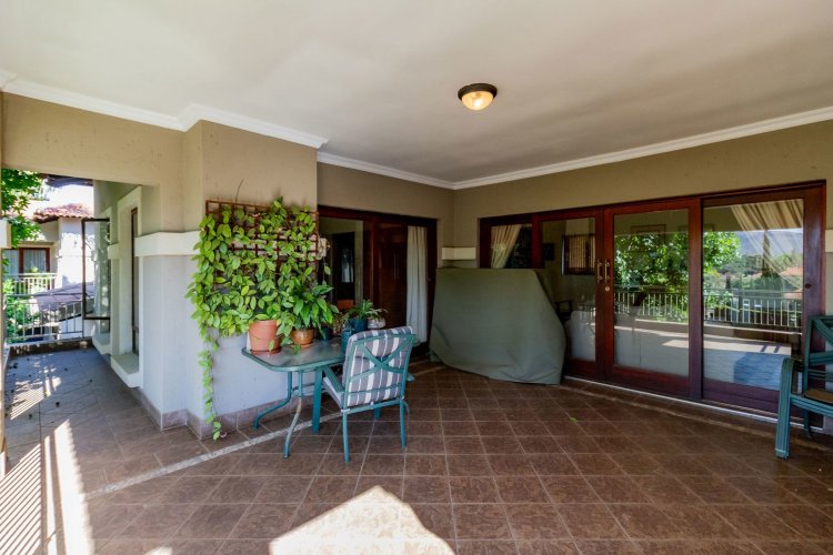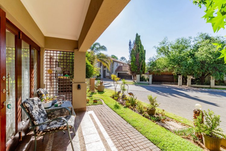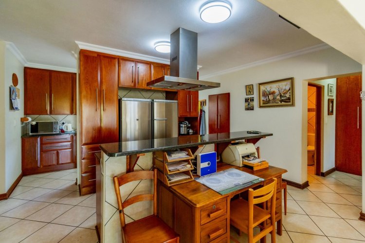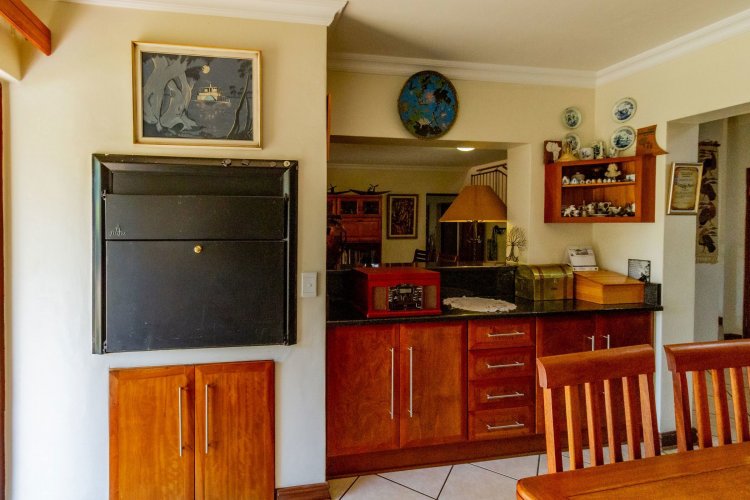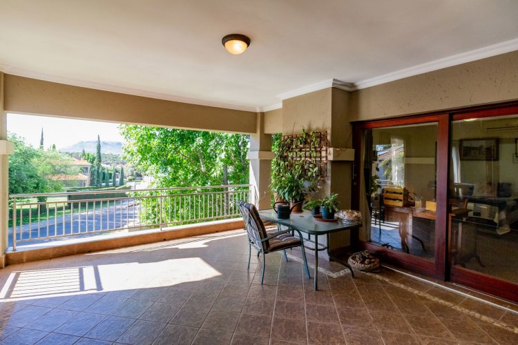 Upstairs, a pyjama lounge with a built-in kitchenette opens onto an expansive L-shaped balcony, where sweeping views of the Magaliesberg Mountains and Xanadu's landscaped greenbelts set the perfect backdrop for relaxation. Two additional en-suite bedrooms share the same tranquil outlook and direct balcony access.