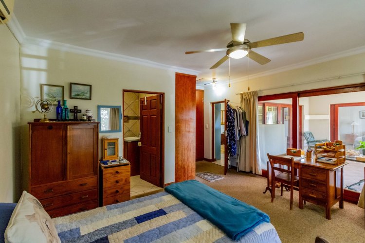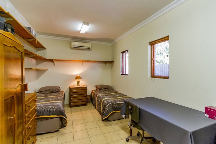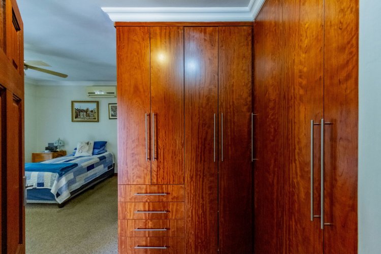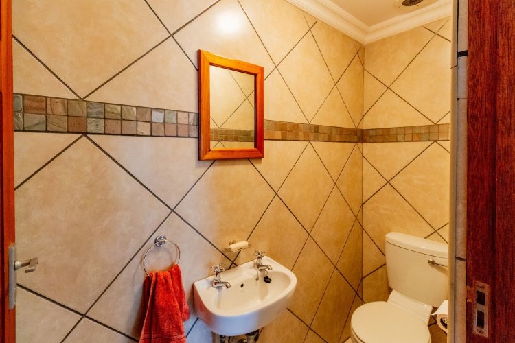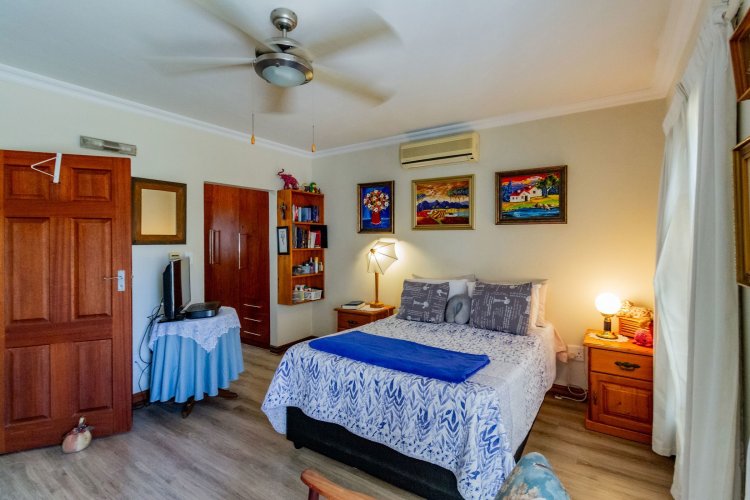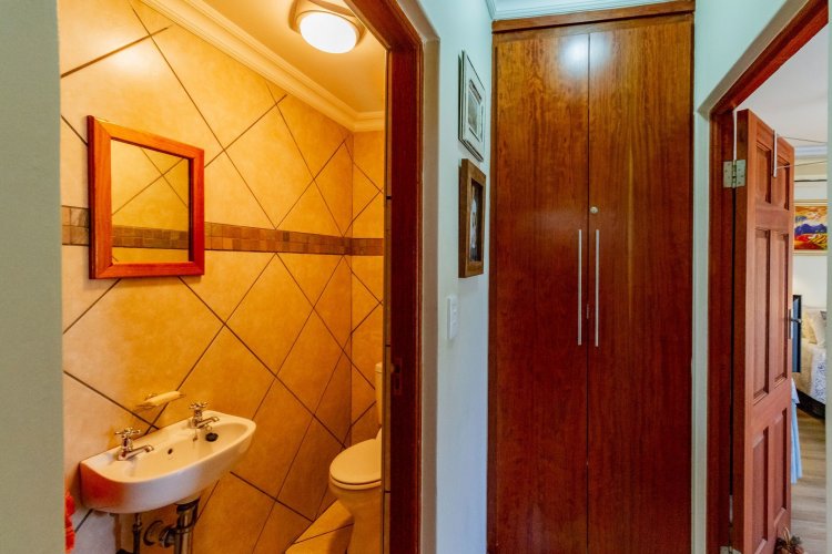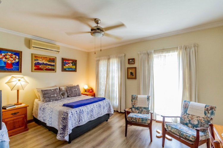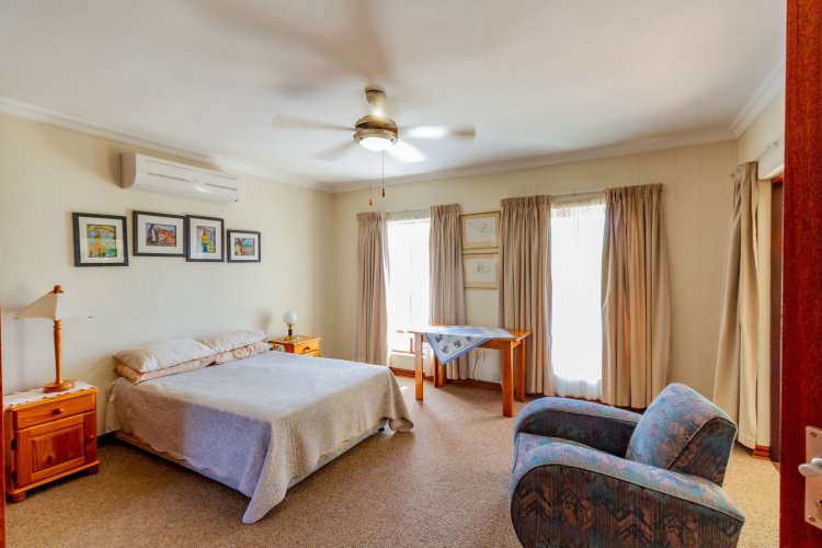 The main bedroom on the ground floor offers convenience and comfort with laminated floors, air conditioning and a luxurious full en-suite bathroom. A guest bathroom is also located on this level for added ease.