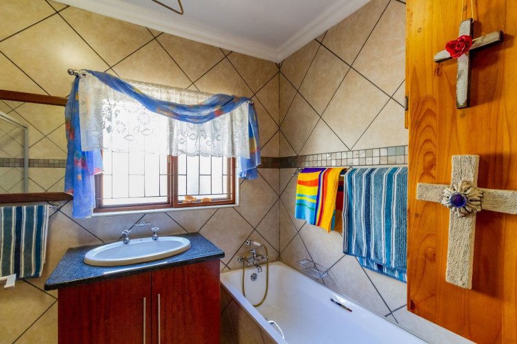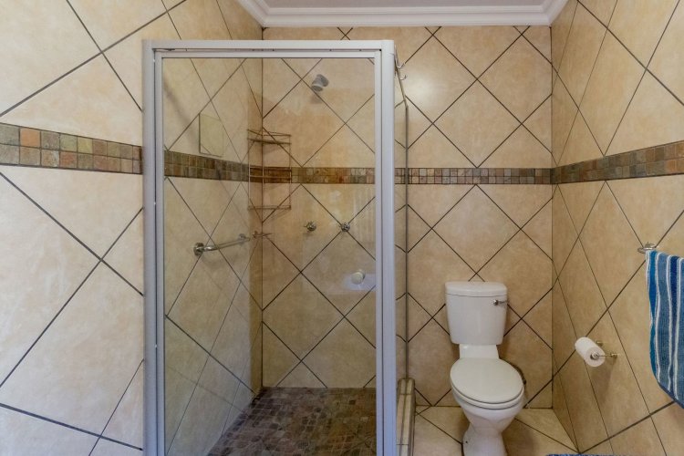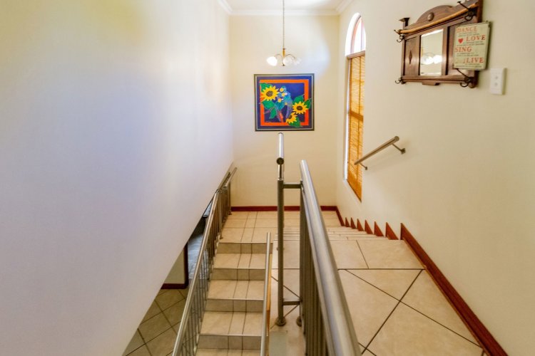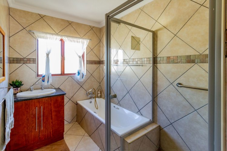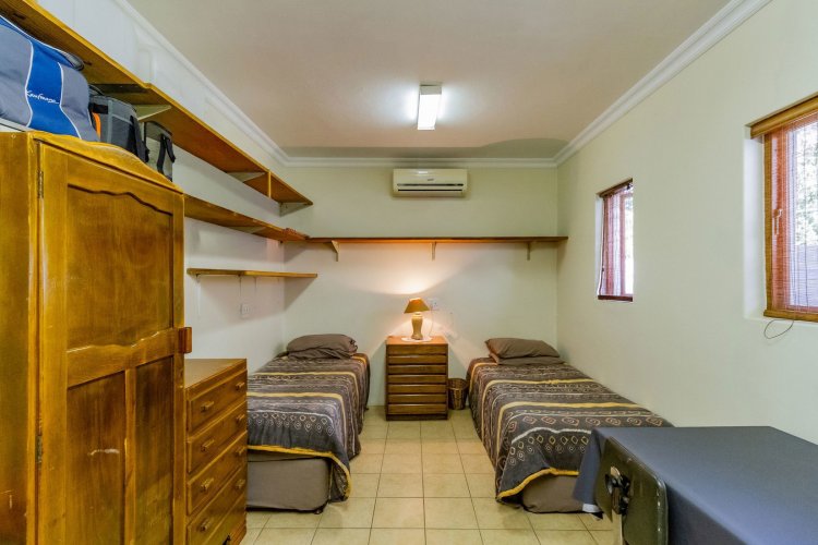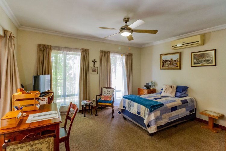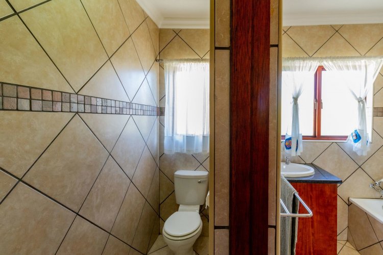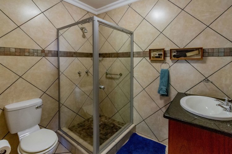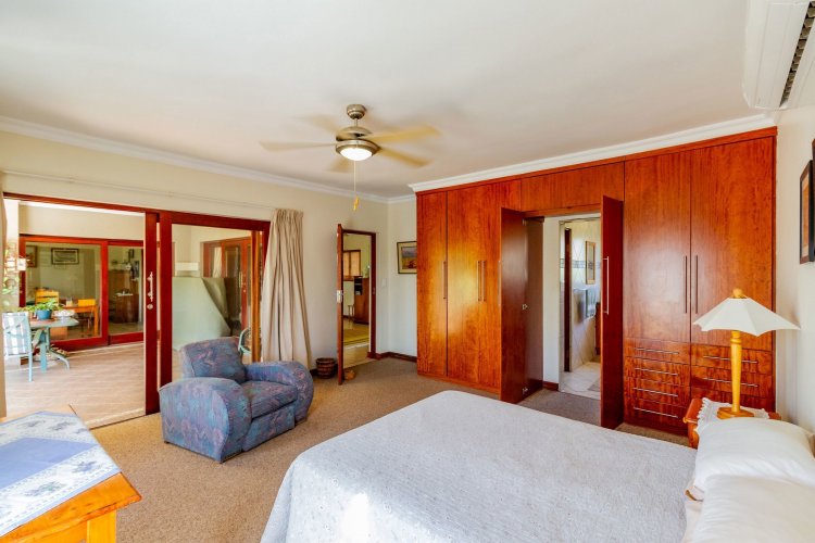 The main bedroom on the ground floor offers convenience and comfort with laminated floors, air conditioning and a luxurious full en-suite bathroom. A guest bathroom is also located on this level for added ease.