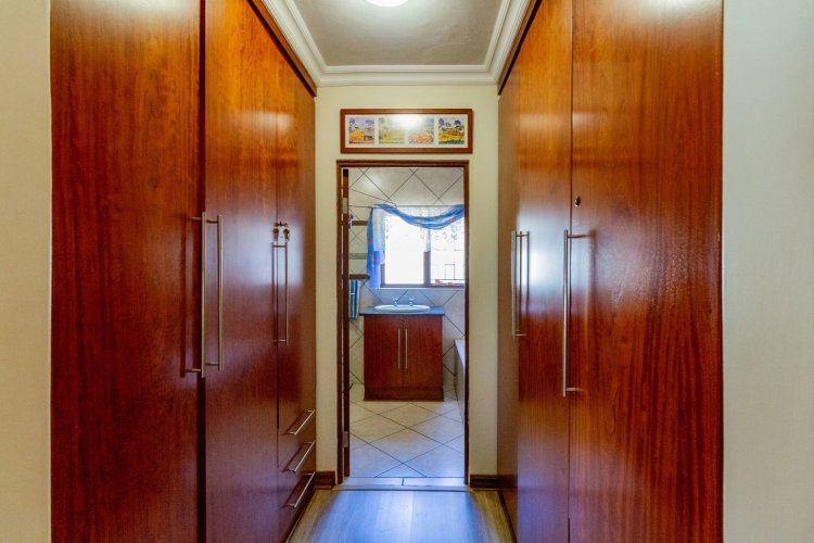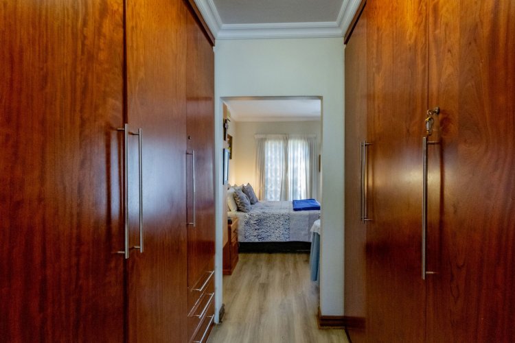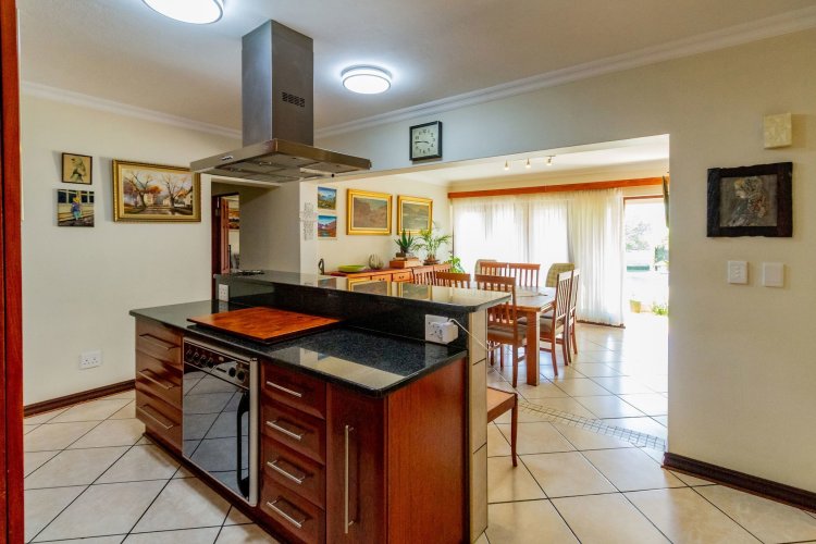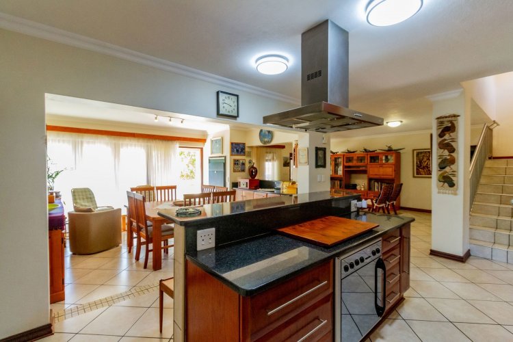 The well-designed kitchen features a clever layout with a separate scullery, glass hob, and space for two fridges. A walk-in pantry provides ample storage for appliances and groceries, an entertainer's dream.