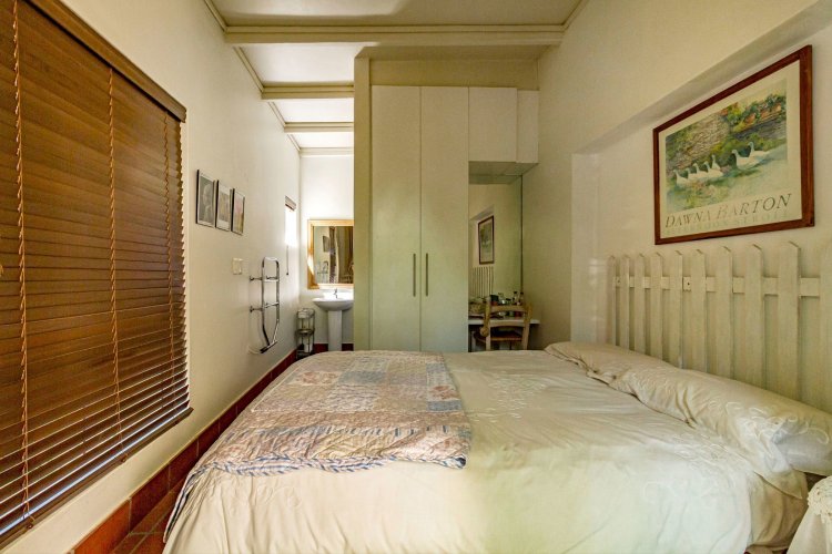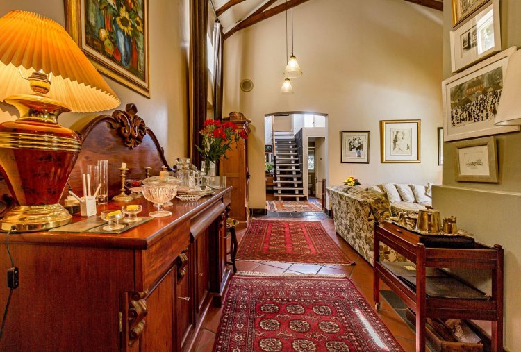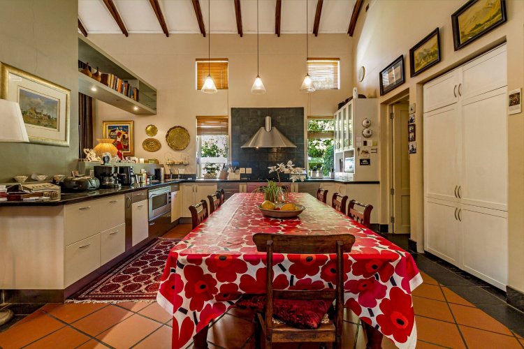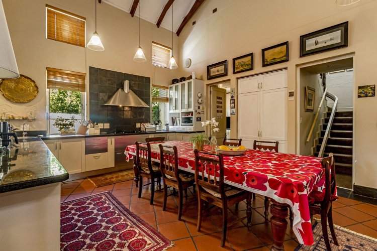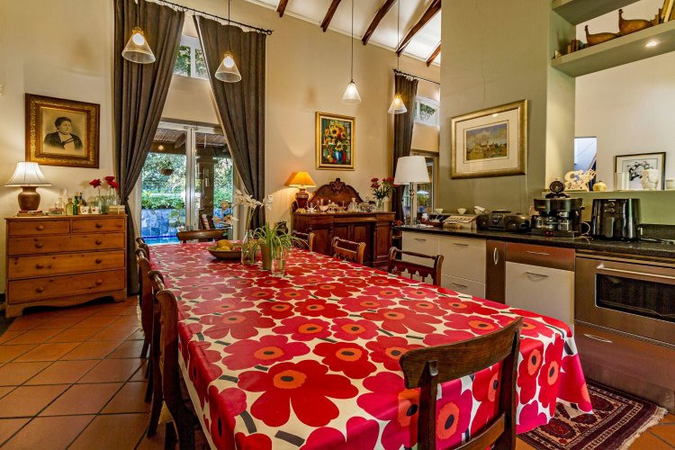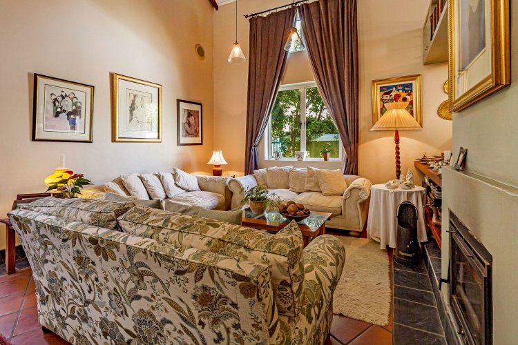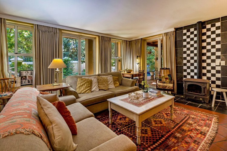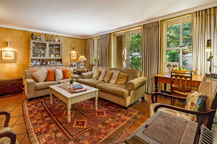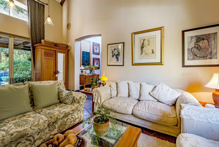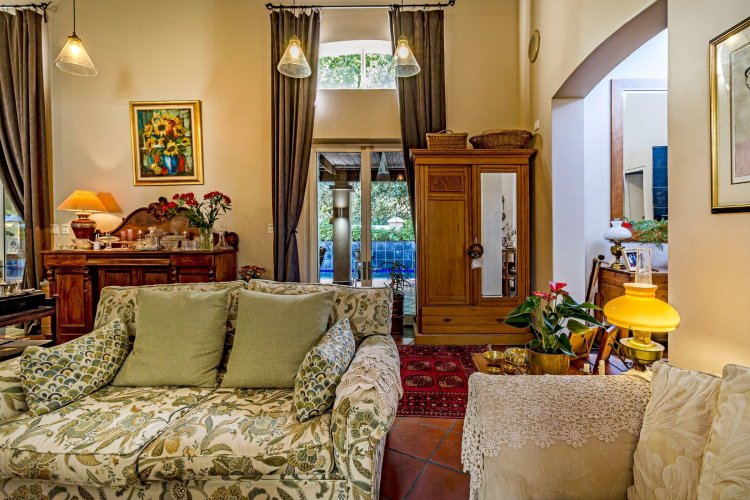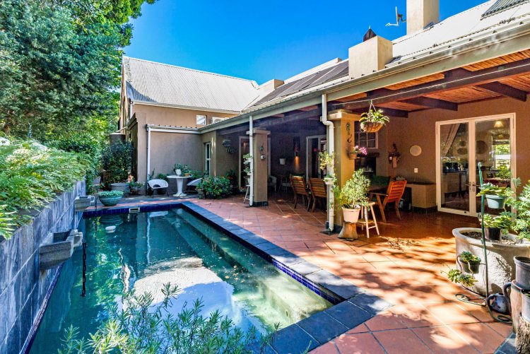 Designed in a timeless farm-style with double-volume ceilings, rustic finishes and generous open-plan living spaces, the home exudes warmth, character and understated luxury. The flowing layout includes three expansive reception rooms, a television lounge with fireplace, a formal lounge with combustion oven, dining area and a spacious kitchen — the true heart of the home — centered around a ten-seater table, ideal for gatherings and family living, open to a large, covered patio overlooking a private swimming pool and water feature, creating a seamless indoor-outdoor entertainment flow. The home comprises three spacious bedrooms and three beautifully appointed bathrooms, as well as a guest cloakroom. The main suite is a private retreat with a walk-in dressing room, double shower, double basin, lounge area and a balcony with serene views across the river and oak trees.   The second bedroom, with its own lounge/pajama area and kitchenette, offers the flexibility of a guest flat.  This lounge area with balcony offers beautiful views onto the Stellenbosch mountain.  A third, ground-floor bedroom enjoys a private entrance and patio. Additional features include a welcoming double-volume entrance hall, cozy study, and an impressive wine cellar.  Double garage and parking for three vehicles in secure area.