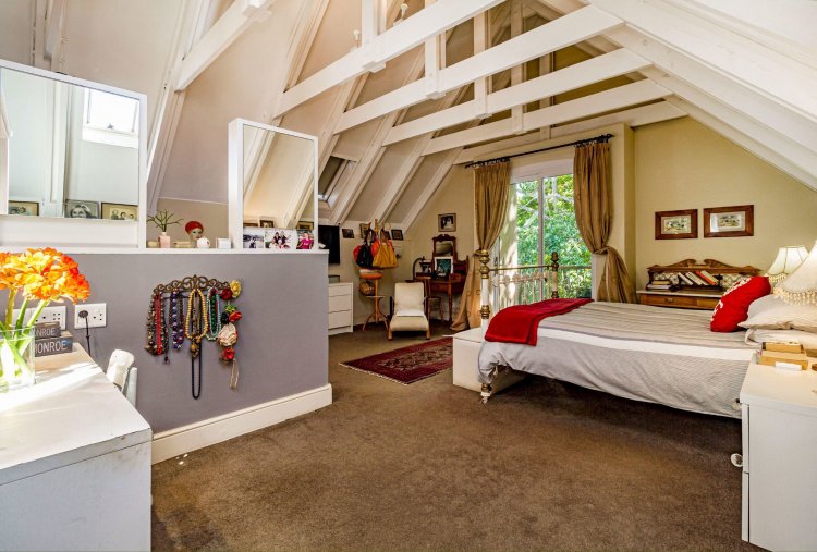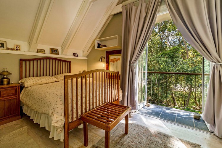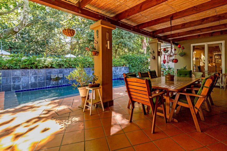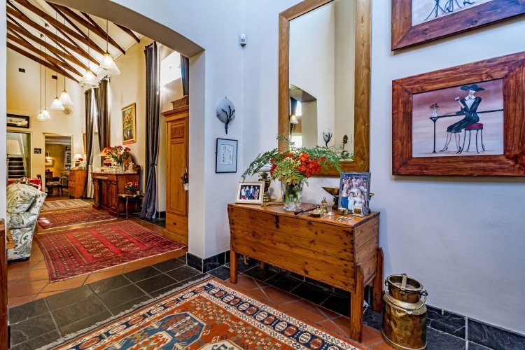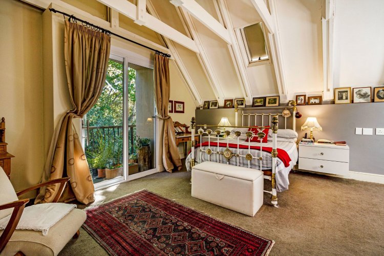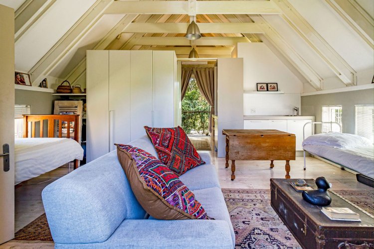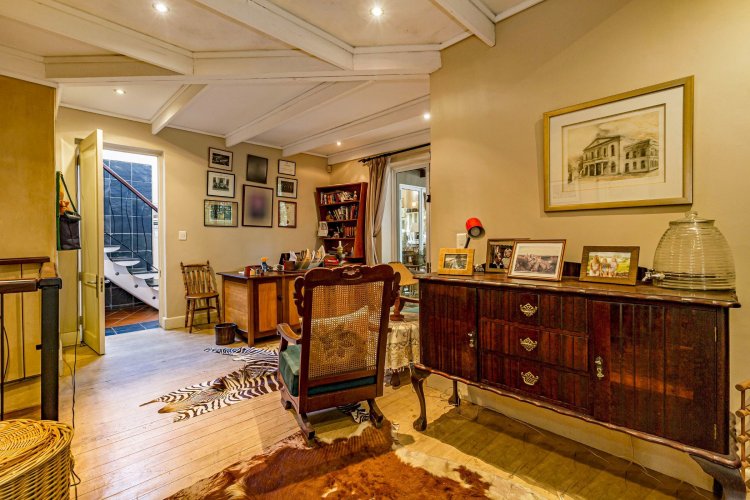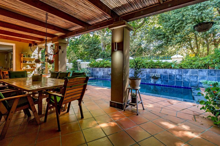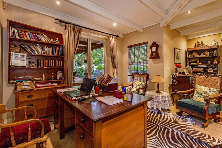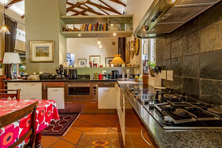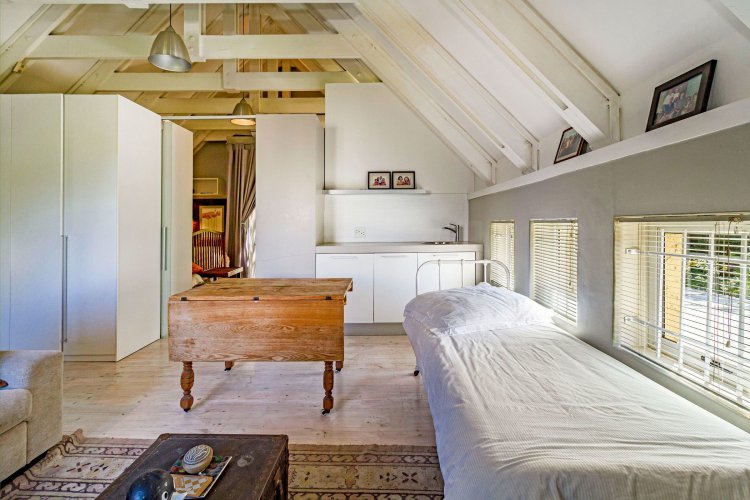 Designed in a timeless farm-style with double-volume ceilings, rustic finishes and generous open-plan living spaces, the home exudes warmth, character and understated luxury. The flowing layout includes three expansive reception rooms, a television lounge with fireplace, a formal lounge with combustion oven, dining area and a spacious kitchen — the true heart of the home — centered around a ten-seater table, ideal for gatherings and family living, open to a large, covered patio overlooking a private swimming pool and water feature, creating a seamless indoor-outdoor entertainment flow. The home comprises three spacious bedrooms and three beautifully appointed bathrooms, as well as a guest cloakroom. The main suite is a private retreat with a walk-in dressing room, double shower, double basin, lounge area and a balcony with serene views across the river and oak trees.   The second bedroom, with its own lounge/pajama area and kitchenette, offers the flexibility of a guest flat.  This lounge area with balcony offers beautiful views onto the Stellenbosch mountain.  A third, ground-floor bedroom enjoys a private entrance and patio. Additional features include a welcoming double-volume entrance hall, cozy study, and an impressive wine cellar.  Double garage and parking for three vehicles in secure area.
