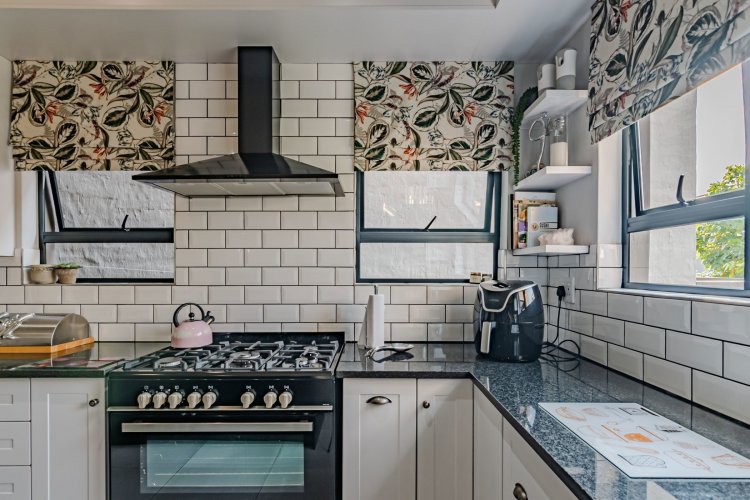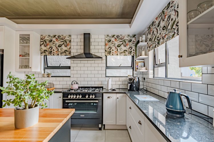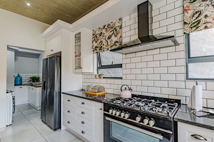The open-plan kitchen, lounge, and dining area flow effortlessly, featuring modern finishes and a gas hob — ideal for those who love to cook and entertain. The lounge, with its cozy gas fireplace, opens onto a covered patio with a built-in braai, perfect for year-round entertaining.
