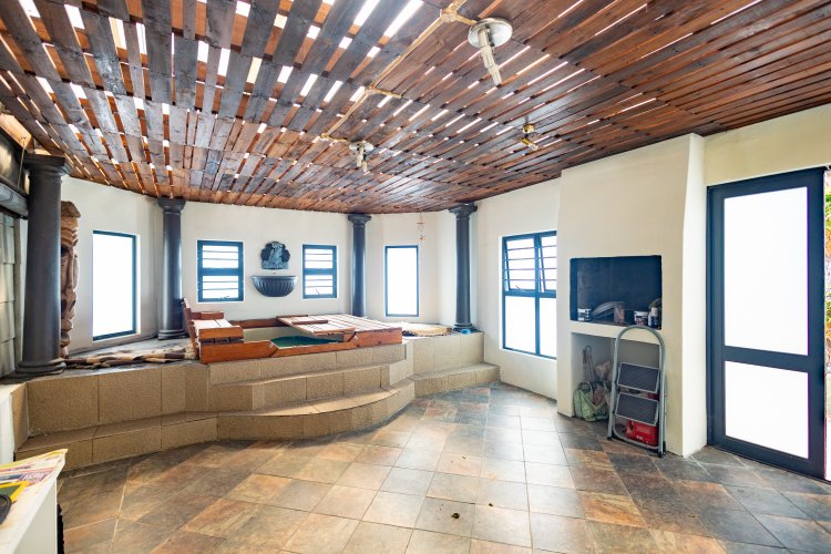 The open-plan lounge and dining area offer a spacious setting, with lounge doors that lead to a large entertainment area, ideal for hosting family and friends. This outdoor space is equipped with a built-in braai and a Jacuzzi, while the dining area features doors that open to a serene backyard complete with a water feature.