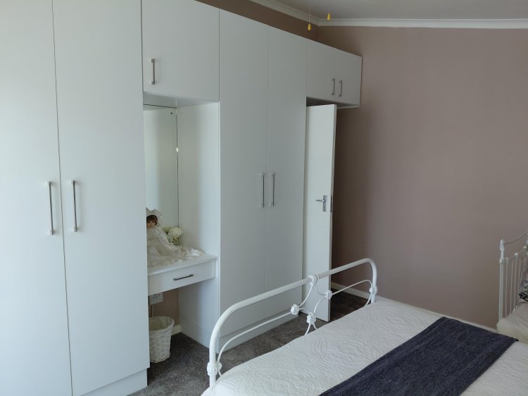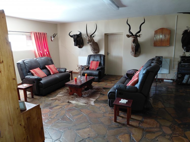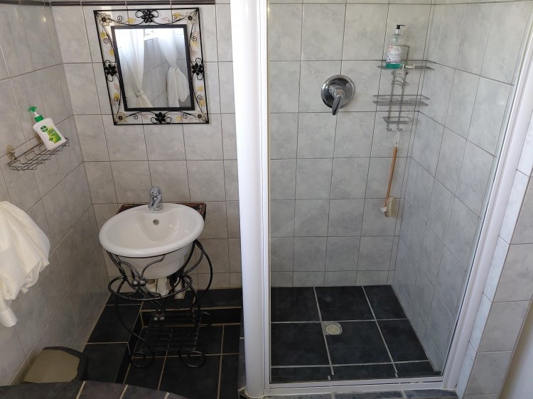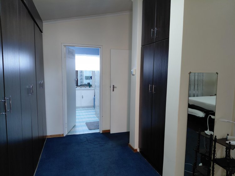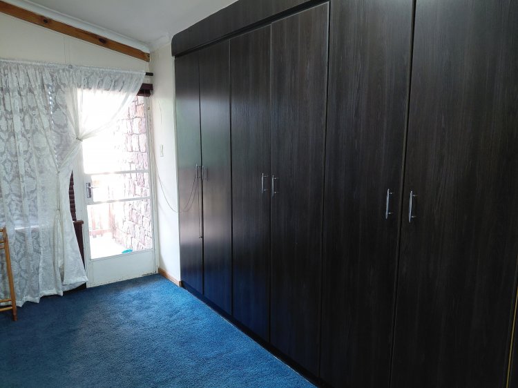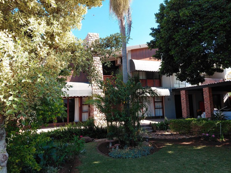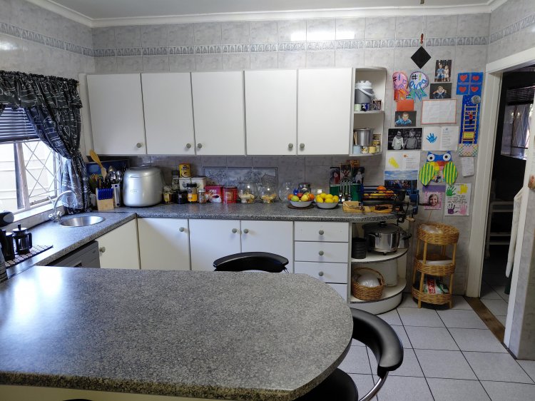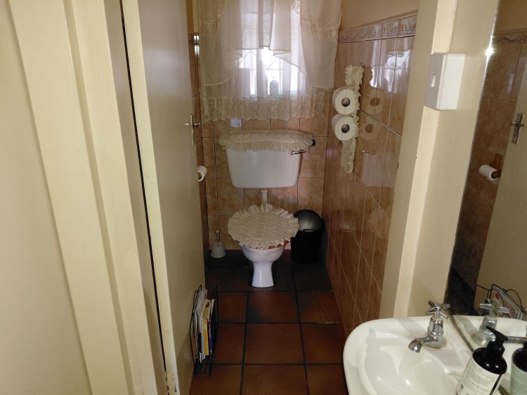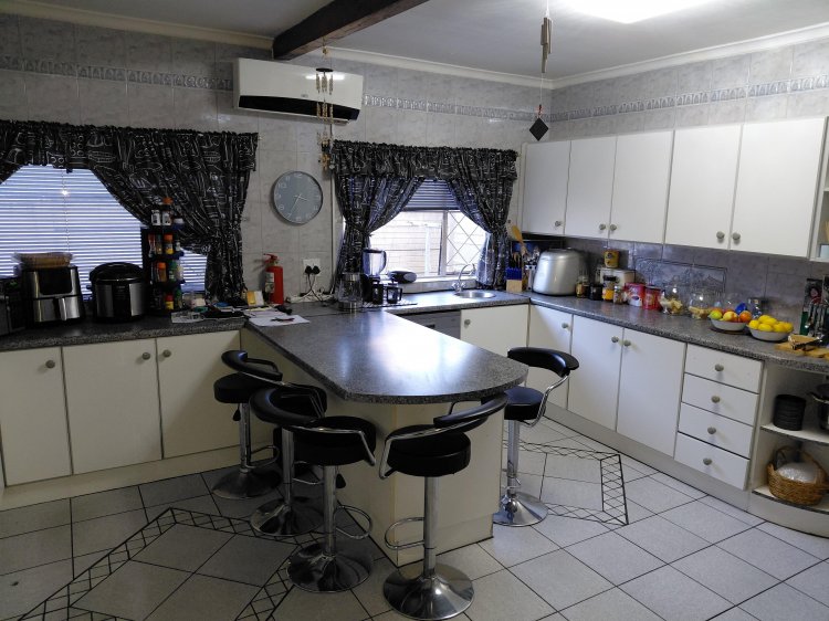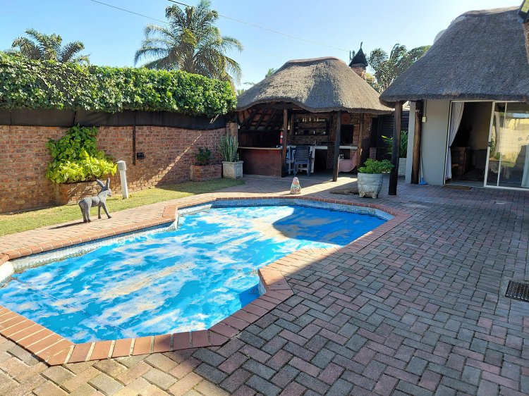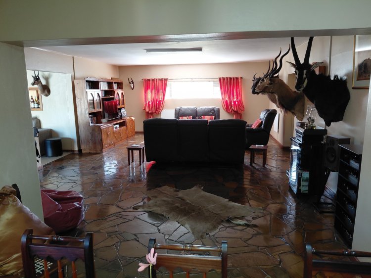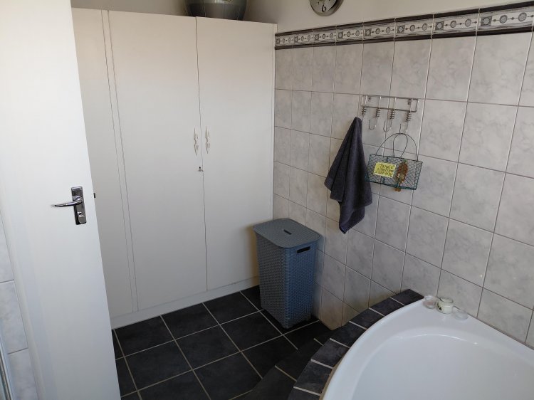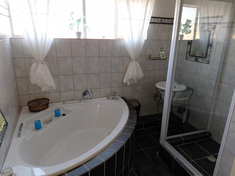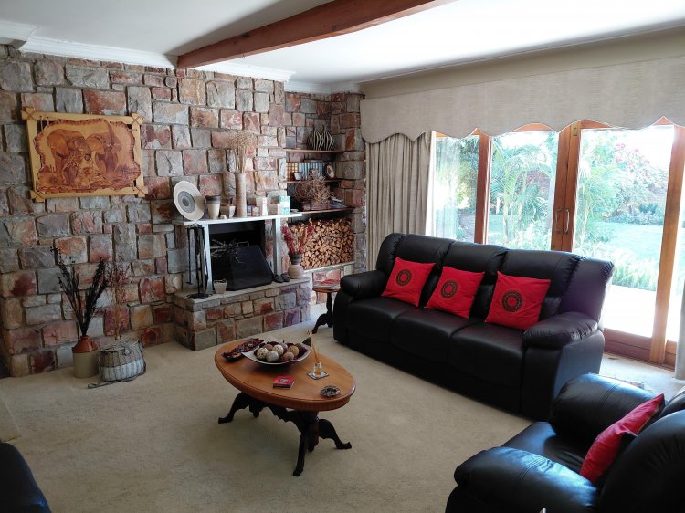 • Double garage plus a carport for four vehicles in front • Beautiful, irrigated garden • Freshly painted throughout • Comprehensive alarm system with beams at the front, back, and upstairs • Fire extinguishers • 15 kW solar system with 16 panels, one inverter, and five 25,000L water tanks (two connected to the kitchen) — all included in the sale The inviting tiled front veranda leads to a wooden deck on the left side of the house. Below the deck is parking for two additional vehicles — easily usable as a workshop. Inside, a tiled entrance hall welcomes you: • To the left, a formal carpeted lounge (with parquet flooring underneath) and a beautiful fireplace set against a warm stone wall. • To the right, a study, currently used as storage, and access to the garage. • Additional storage space under the staircase. The passage leads to a dining room that flows into a spacious open-plan snooker room with slate flooring. There’s also a built-in bar with basin (previously domestic quarters, which can easily be converted back) and a guest toilet. A 4x4m Wendy house outside provides extra storage. The snooker room leads to an indoor braai room with a sliding door to the pool area. Next to the pool is a workbench area (currently used for meat processing by the owner, an avid hunter), covered with a thatch roof. The fibreglass pool is in working order. To the right of the pool is a lapa (4x4m covered braai area) — the thatch has been recently combed. The outdoor space is tranquil, with a high ivy-covered wall behind the lapa, ensuring privacy. Friendly neighbours and an outside toilet complete the picture. The kitchen features built-in cupboards, air conditioning, a gas stove with electric oven and hob, eye-level ovens (top and bottom), and a tiled laundry and scullery with more cupboards. Upstairs (via the staircase from the entrance hall): • A spare bedroom with balcony and built-in cupboards (carpeted) • A second bedroom with air conditioning, built-in cupboards, and shared balcony with the spare room • A third spacious bedroom with a study nook, small kitchenette, ceiling fan, TV point, air conditioning, built-in cupboards, and carpet flooring • Separate toilet and bathroom with cupboards, corner bath, shower, and basin The main bedroom has its own balcony, air conditioning, ample built-in cupboards, and an en-suite bathroom (with bath, shower, basin, and extra cupboards). A door from the bathroom leads to the attic, featuring a wooden floor.