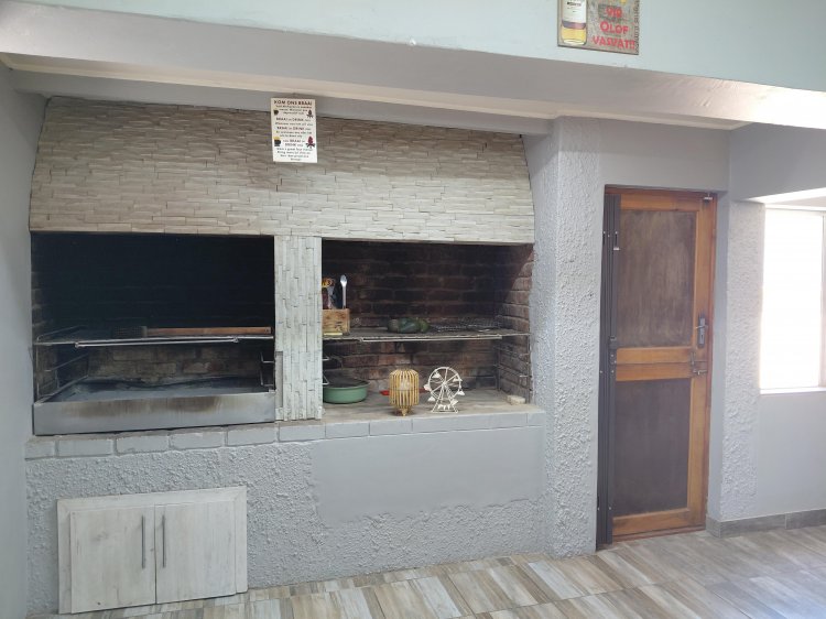 From the study, you enter a spacious under-roof entertainment and braai area, secured with security gates. This area is fully tiled and offers: • Double built-in braais • Built-in cupboards and kitchenette • Second lounge area with air conditioner