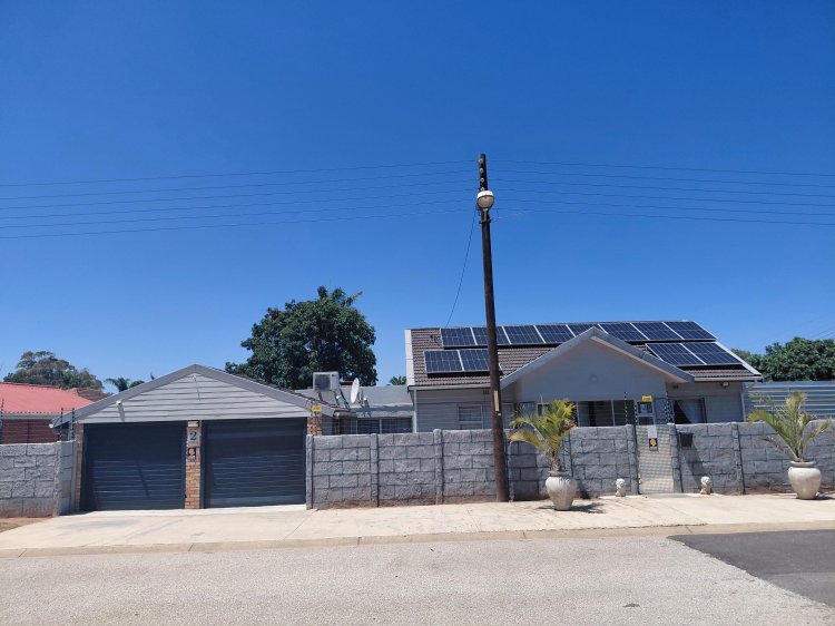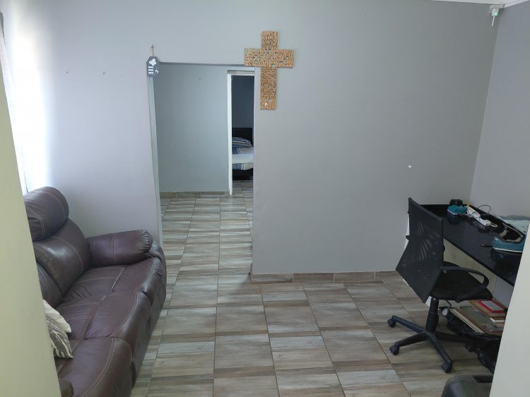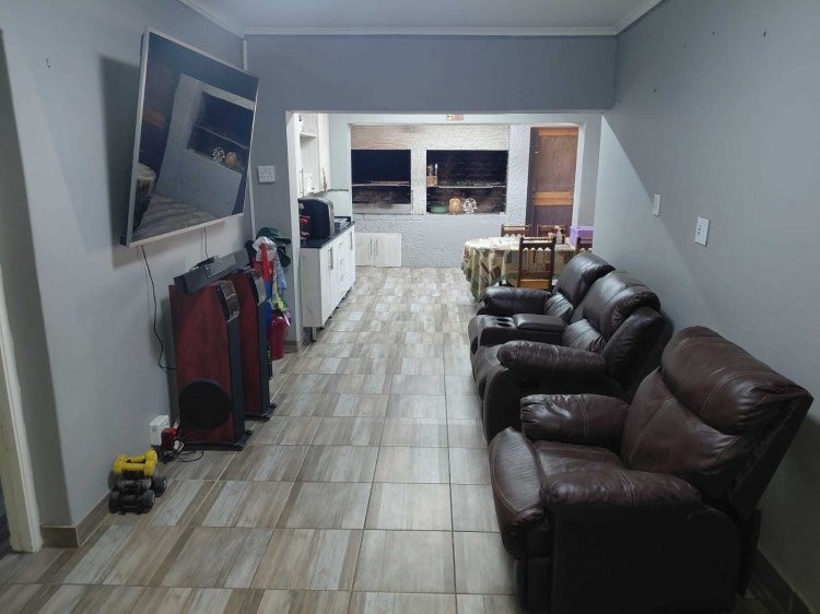 The home features a tiled roof, aluminium window frames, and is fully enclosed with an electric fence, alarm system, 6 cameras, and 3 beams. Energy efficiency is enhanced with 12 solar panels, prepaid electricity, and inverters (included). The property is so efficient that electricity is only purchased every four months.