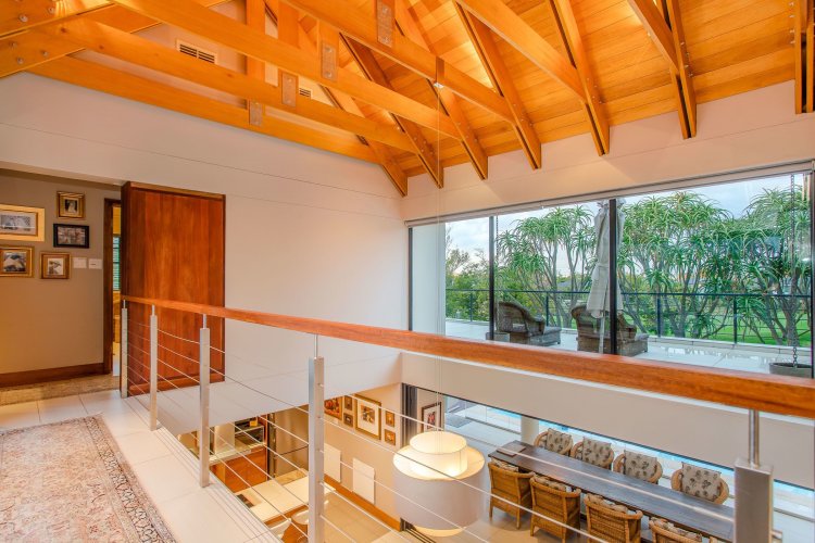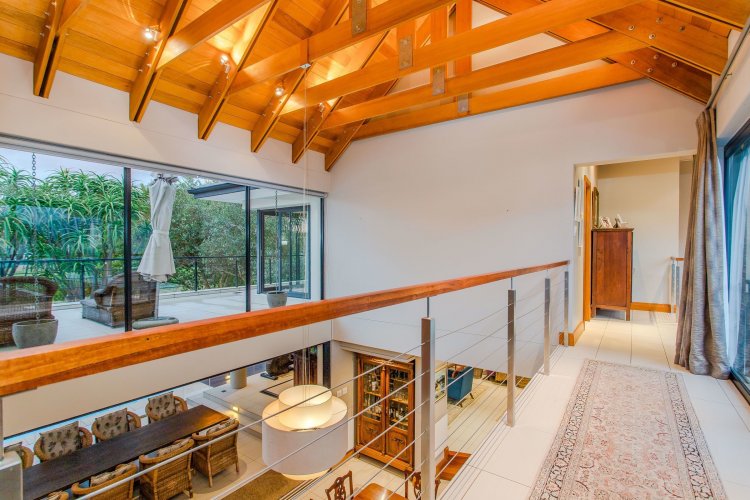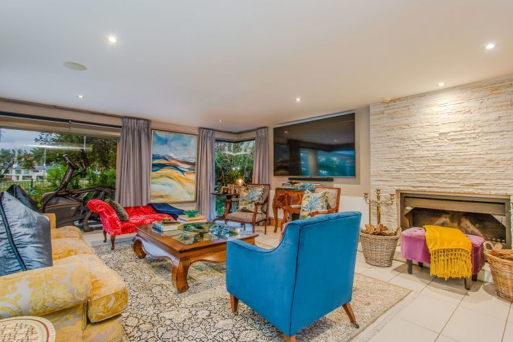 The split-level living area adds architectural interest, with a generous sitting room centred around a large wood-burning fireplace and seamless flow into the indoor entertainment patio — ideal for year-round living.