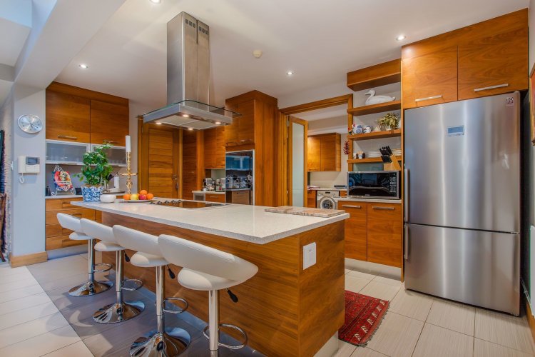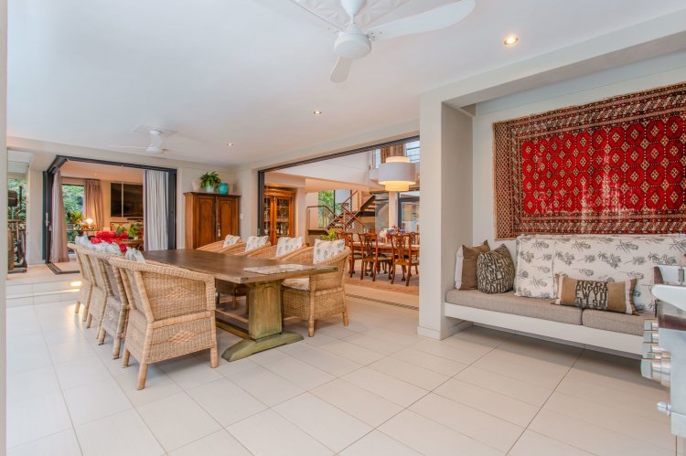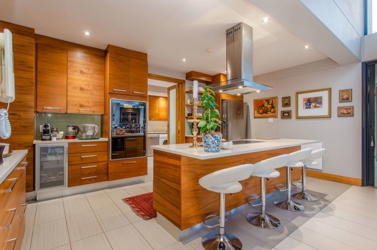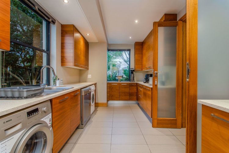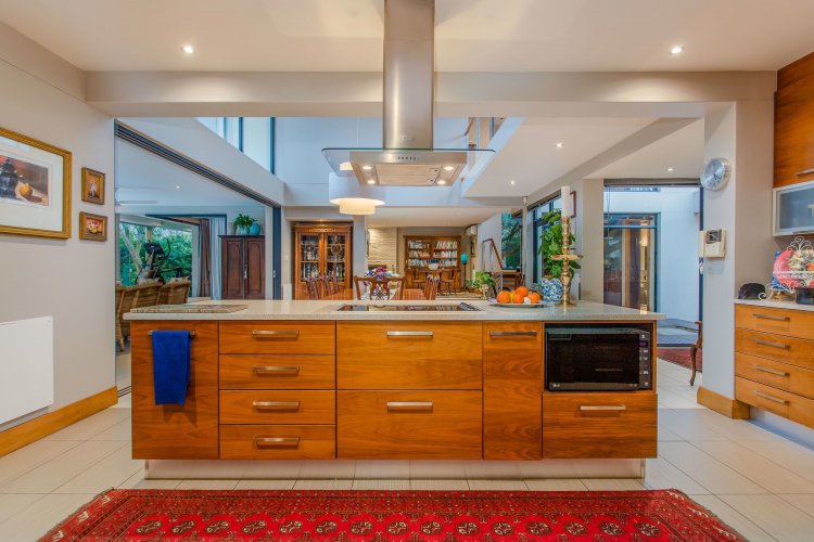 The double-volume dining area forms the heart of the home, opening through frameless glass stacking doors onto a lush garden and an inviting indoor braai patio — the perfect spot to watch the sun dip behind the mountains. The open-plan kitchen is both stylish and functional, featuring a large central island with breakfast bar, walk-in pantry, and separate scullery leading to a dedicated laundry room and courtyard.