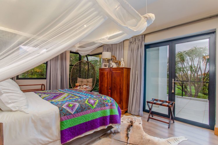 Upstairs, three spacious bedrooms enjoy soft natural light and elevated views. The main suite includes a dressing area, vanity, and full en-suite bathroom, opening onto a private balcony with glorious fairway vistas. Two further bedrooms share a family bathroom, while a versatile fourth bedroom — currently used as an office — and an additional bathroom are located on the ground floor, opening to a charming courtyard garden.