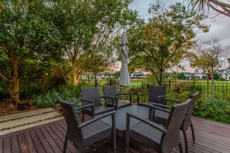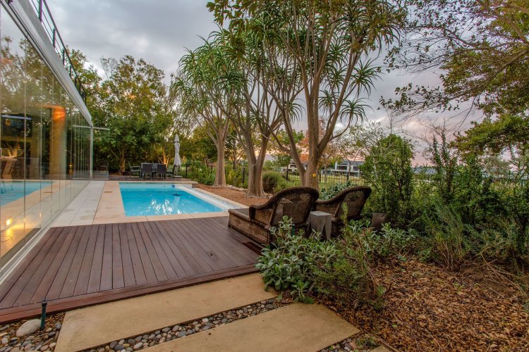 Outdoors, a rim-flow swimming pool with wooden deck and a seating area overlooking the golf course path create a tranquil setting for relaxation and entertaining.