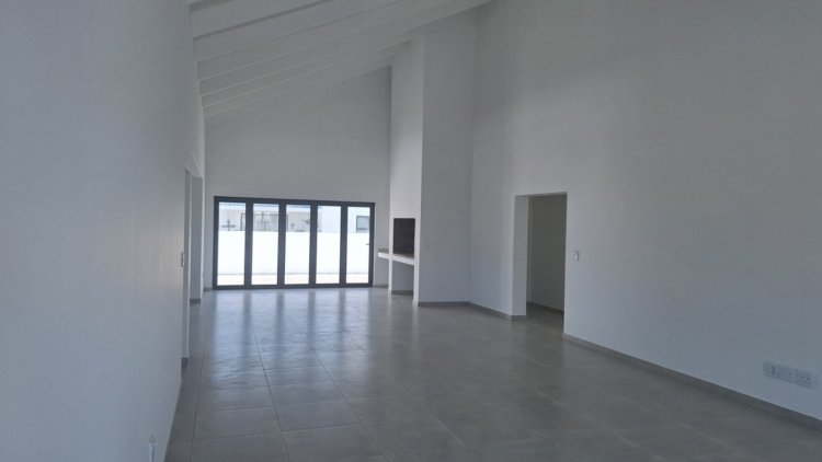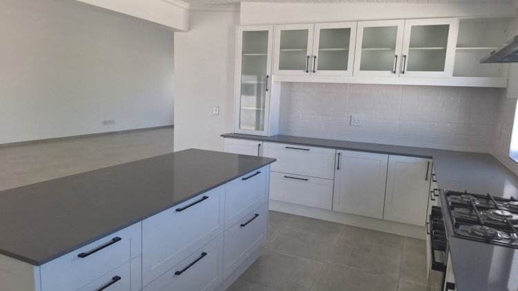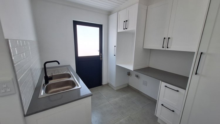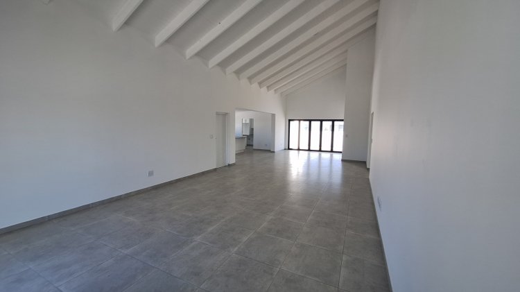 The open-plan living and dining area is enhanced by high-pitched ceilings, creating a bright, airy space ideal for everyday living. The kitchen includes a walk-in pantry and separate scullery, keeping the main area clean and functional for hosting or family use.