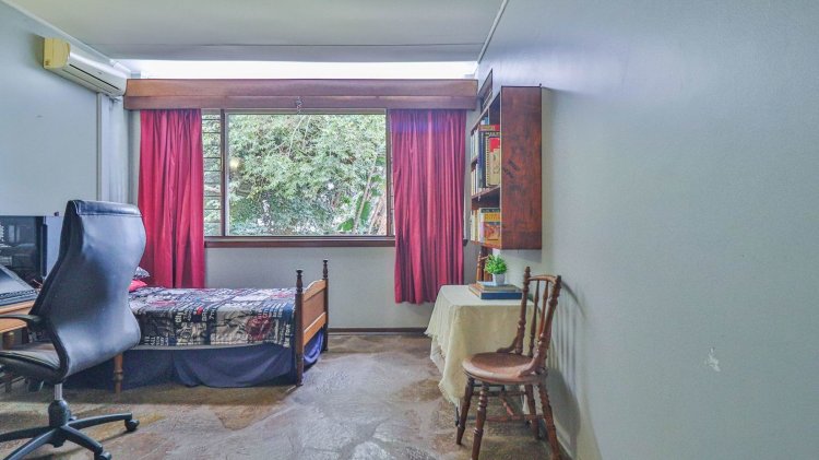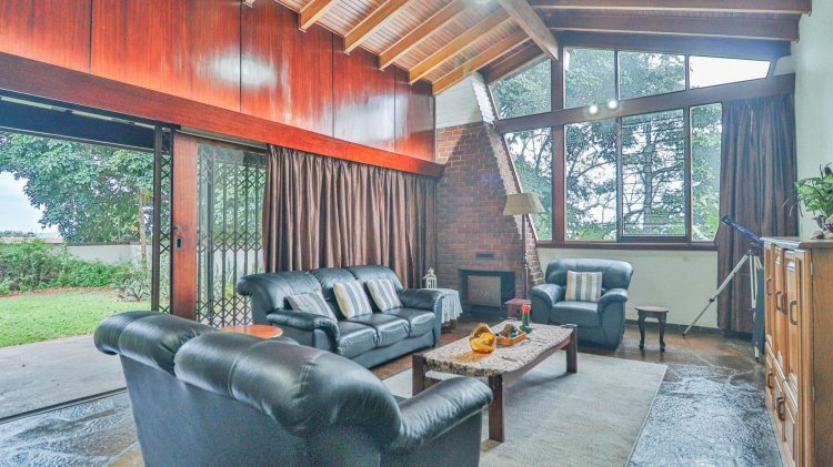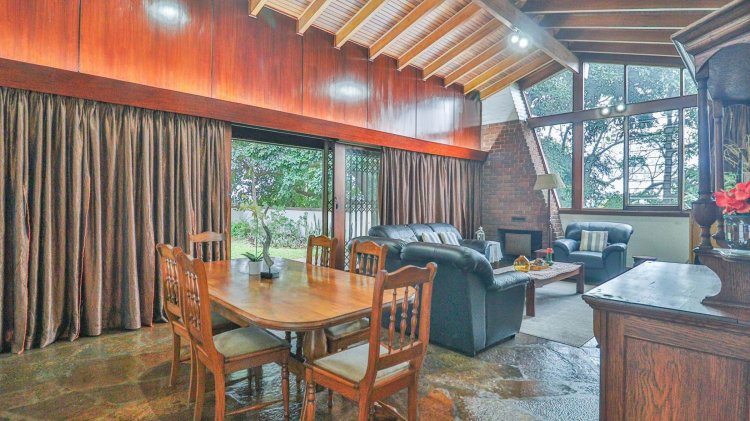 At the heart of the home lies a magnificent, ultra-large living and dining area, crowned by a soaring wood-panelled ceiling and illuminated by a striking feature window. Sliding doors open to a deep, covered patio, offering seamless indoor-outdoor flow to a private, level garden—a serene haven filled with mature indigenous trees.