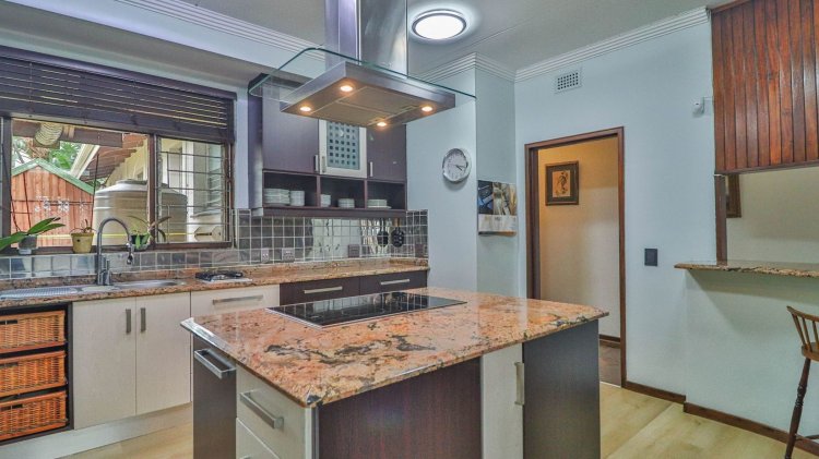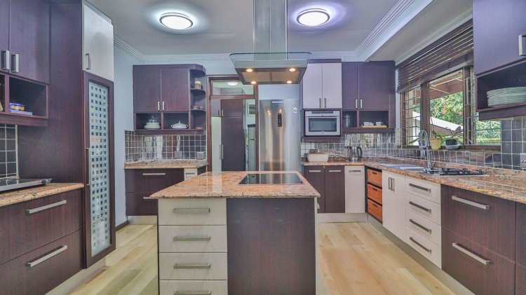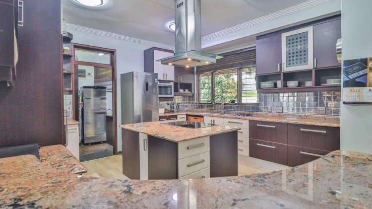 The designer kitchen is a chef's delight, featuring sleek granite countertops, a central glass-top island hob, under-counter oven, built-in domino gas stove, and prep sink. A separate scullery with dual sinks, a spacious pantry cupboard, and space for multiple appliances including plumbing for a washing machine adds convenience and functionality.