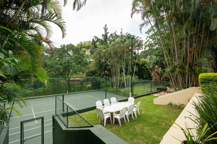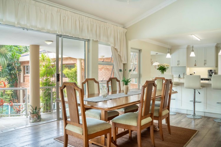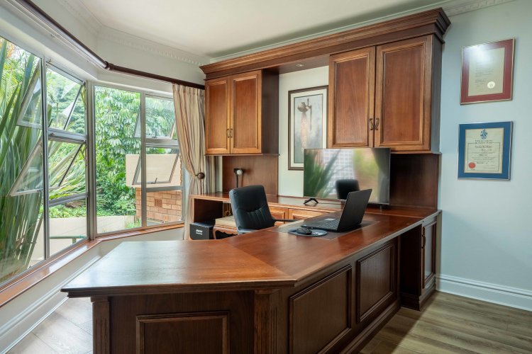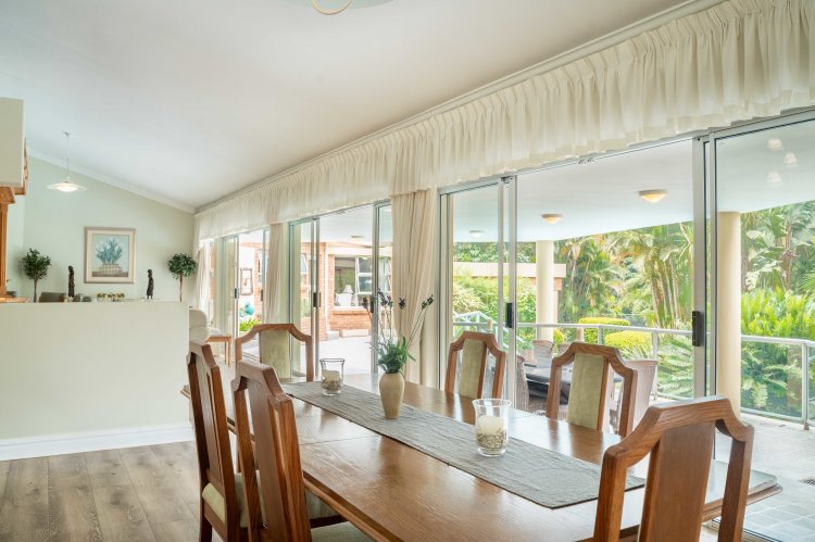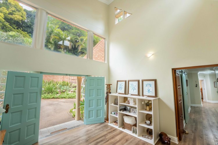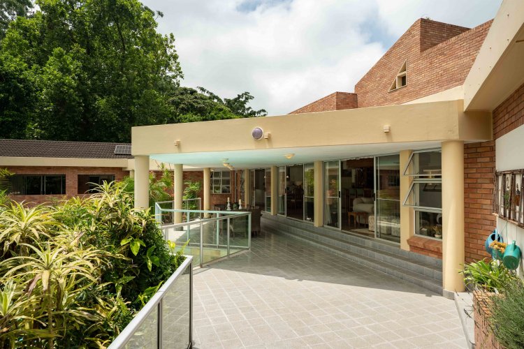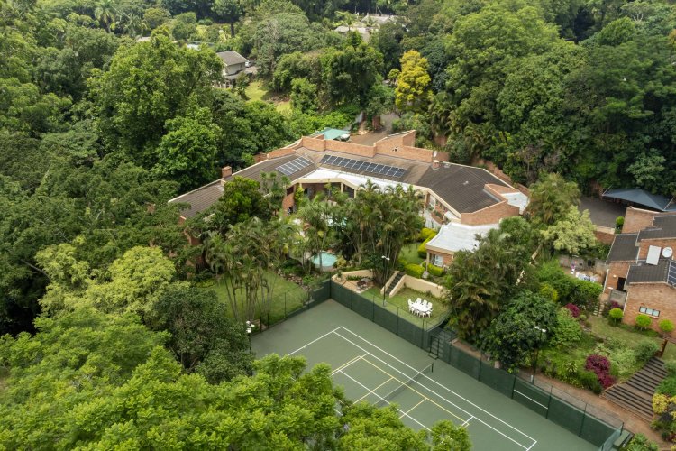 This exceptional mega-home offers a rare blend of modern luxury, space and resort-style living, set on a 7,163sqm property in Kloof’s sought-after Blue Zone. The land has been sectionalised into two separate, extremely private homes with a shared driveway and floodlit tennis court. The main residence of approximately 770sqm features an elegant entrance hall leading to expansive open-plan living areas with soaring ceilings, fireplace, oak bar, and seamless indoor-outdoor flow to a covered verandah. The verandah overlooks two swimming pools, landscaped gardens, the tennis court and a tranquil stream. The designer kitchen is fitted with quartz countertops, a five-burner SMEG hob, electric oven, separate scullery, laundry and second pantry, with a sunny breakfast area and direct access to the garages. A professionally fitted study may also function as a 5th bedroom.