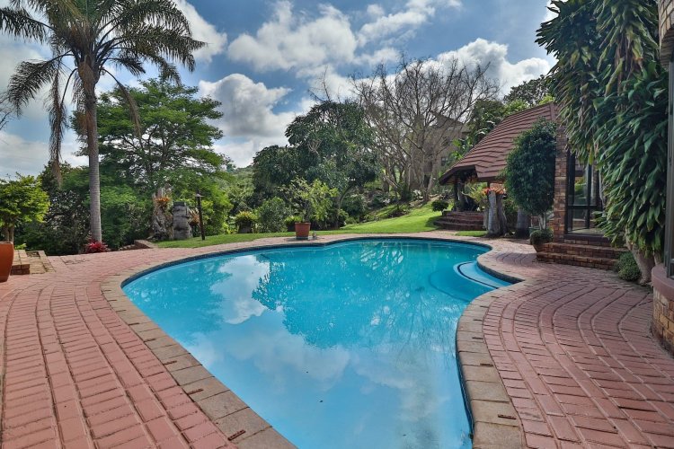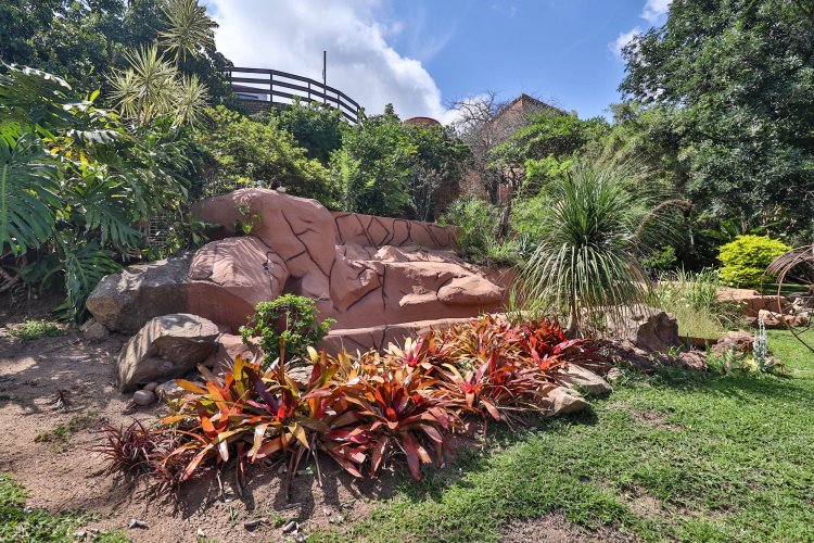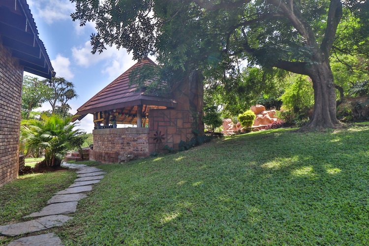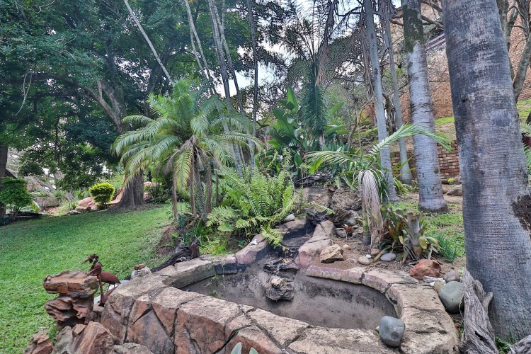 The lapa (60Sqm) forms the centerpiece in this manicured garden surrounded by water features and lush green lawn.