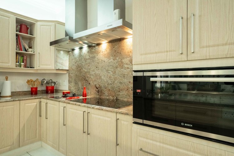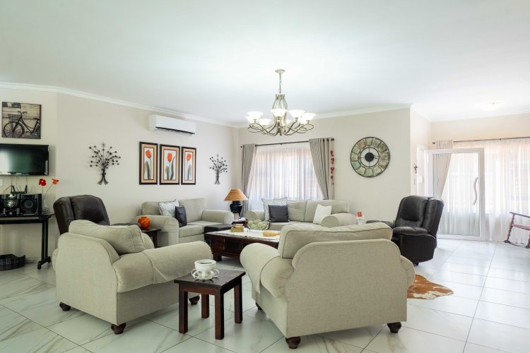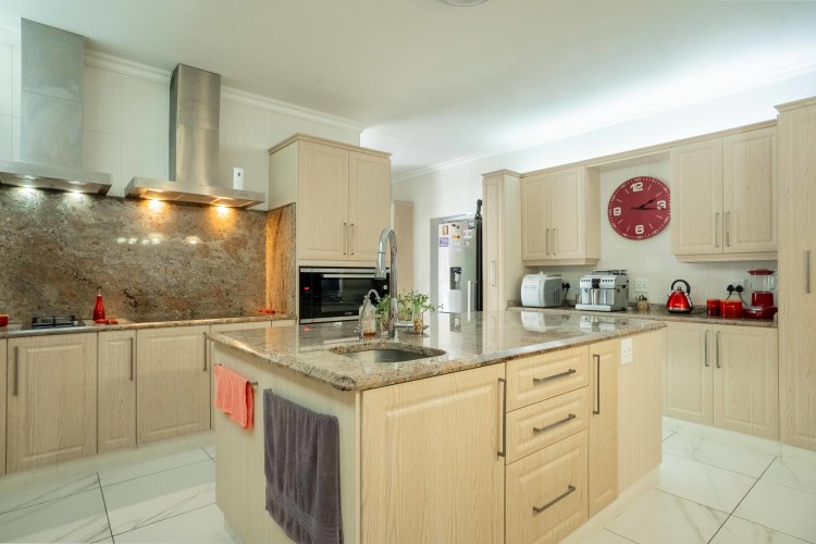 At the heart of the home is a kitchen to fall in love with – spacious, elegant and designed for both family living and entertaining. A large central island with a prep bowl anchors the space, complemented by lovely countertops and ample workspace. The scullery and laundry are conveniently tucked just off the kitchen, seamlessly connected so they remain part of this expansive, stylish open-plan area without disrupting its clean aesthetic.