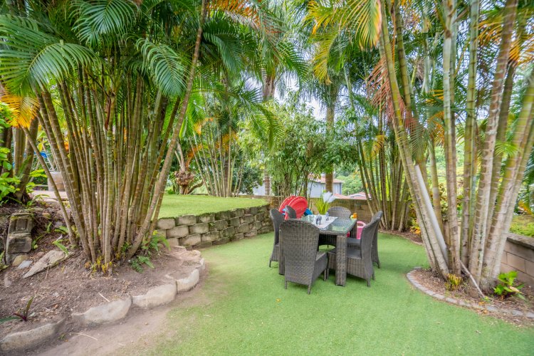 The sleeping wing comprises 3 bedrooms on the ground floor and a palatial master suite on the upper level. This room features a large walk-in-closet, full modern en-suite and opens out to 2 balconies boasting the most splendid tree-top nature views. Additionally, there's a self-contained teen-pad with en-suite bathroom, and separate entrance (easy conversion to granny flat), a 2nd covered entertainment patio above the garage, automated entrance gate with intercom access, alarm system, beams, and CCTV.