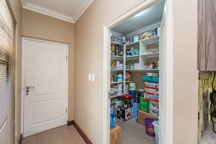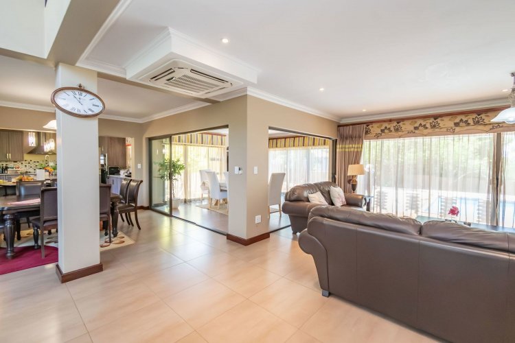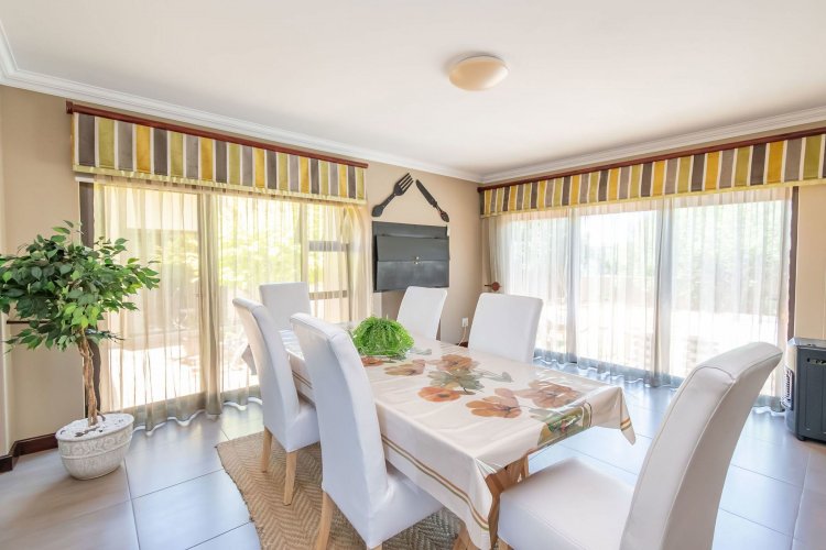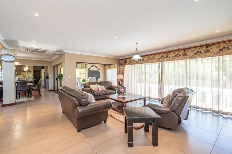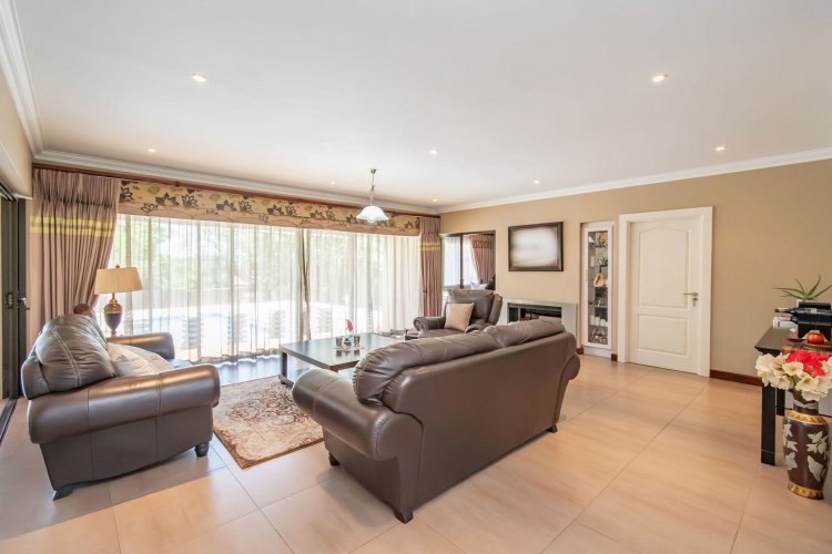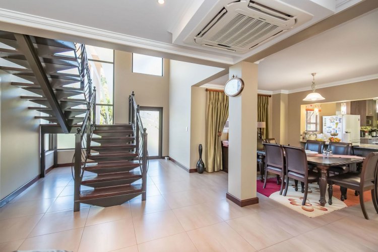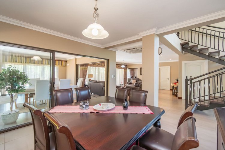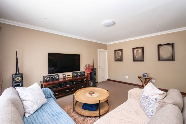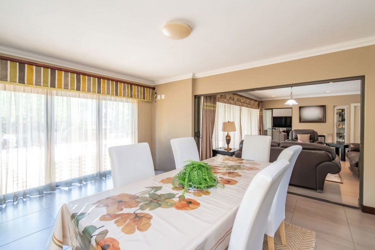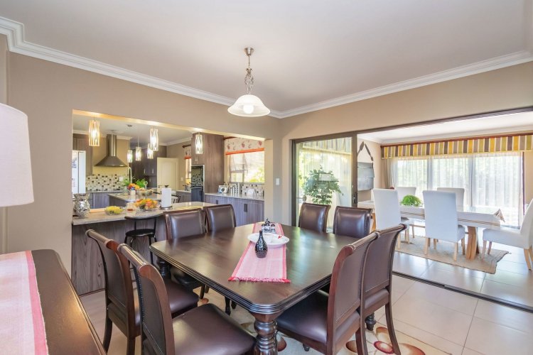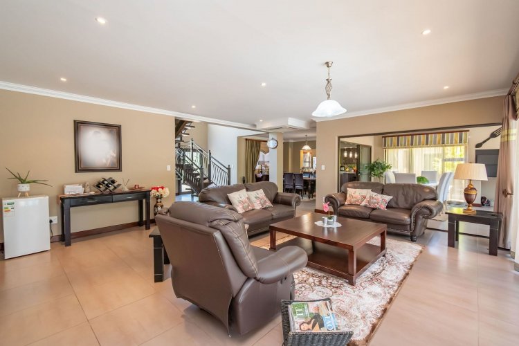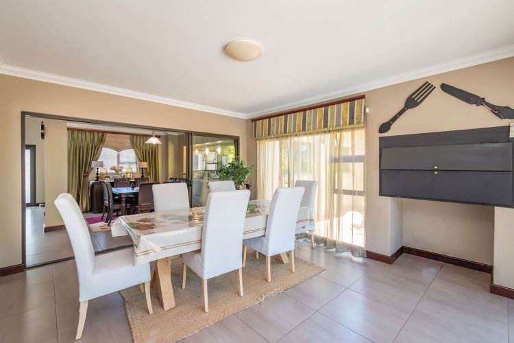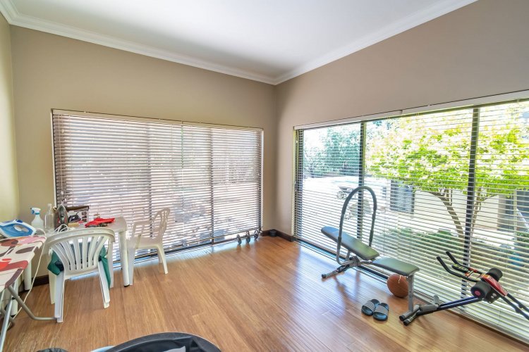Living spaces are beautifully interconnected, with a private study, a formal lounge, a TV room and a dining room all designed around an impressive open-plan layout. An indoor braai area anchors the entertainment space, making gatherings enjoyable throughout the year. The kitchen is supported by both a scullery and a pantry, and a conveniently located guest toilet adds further practicality and an adjoining gym area that enhances the home's relaxed, family-friendly atmosphere..