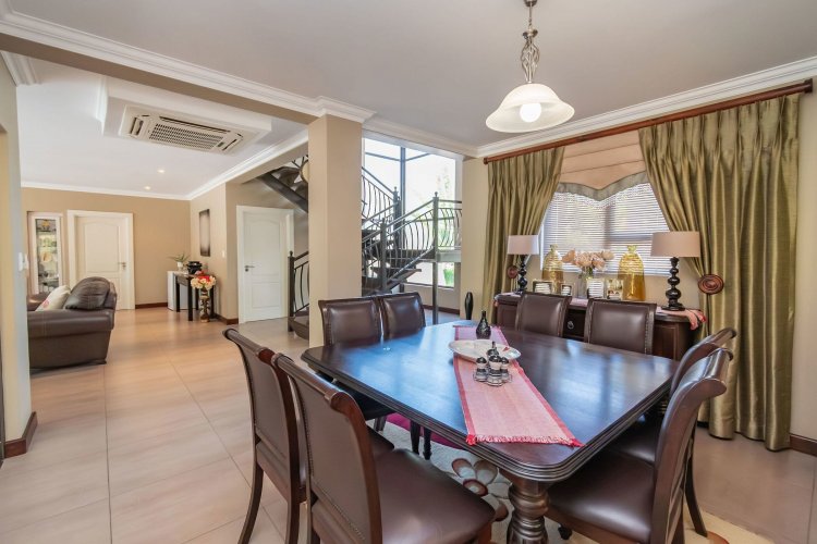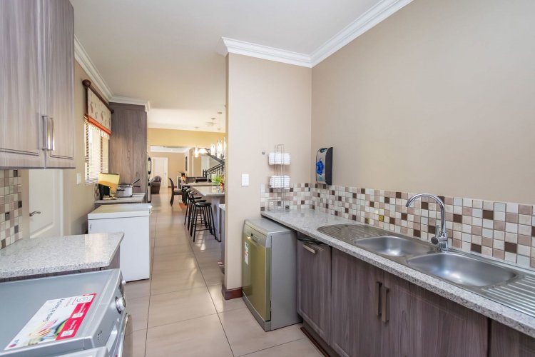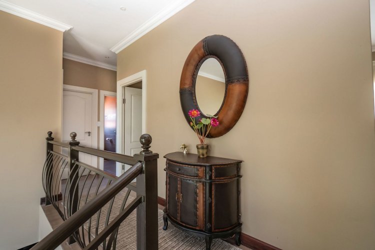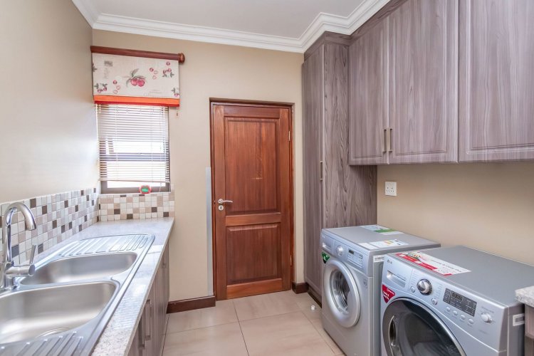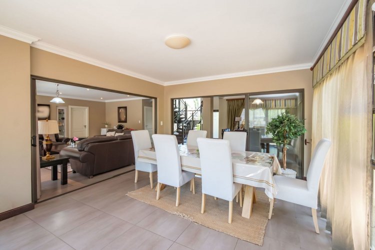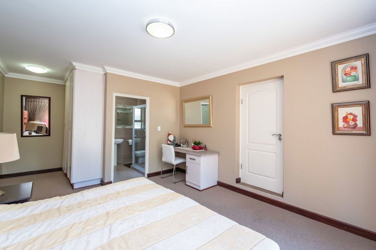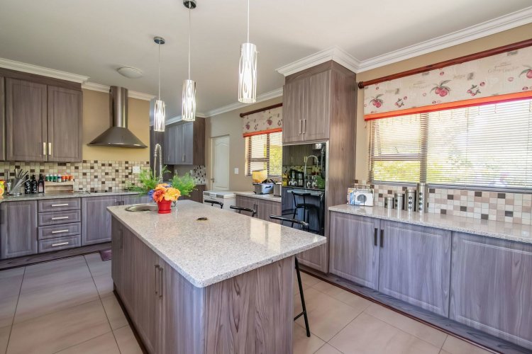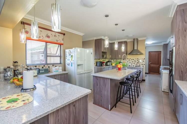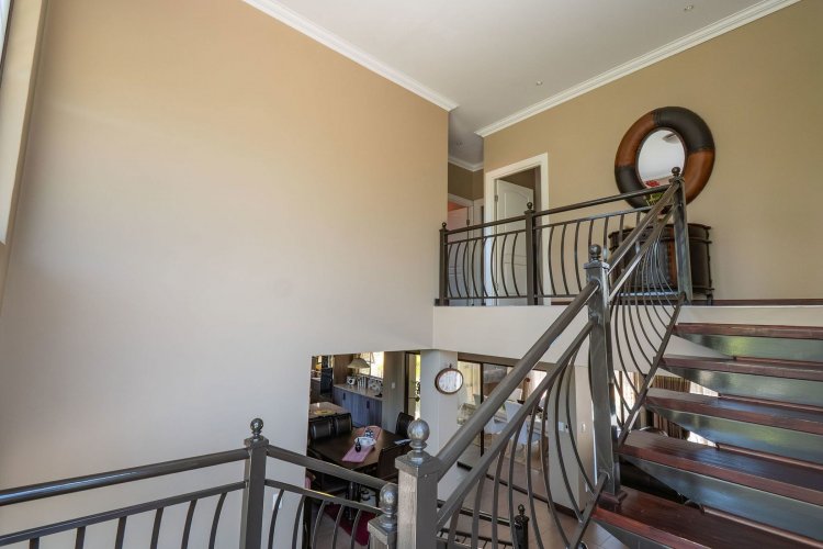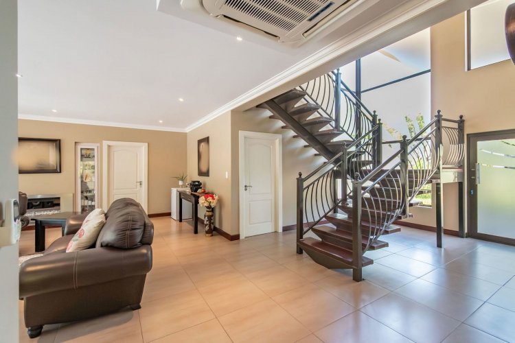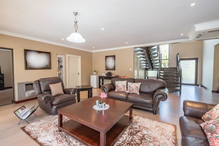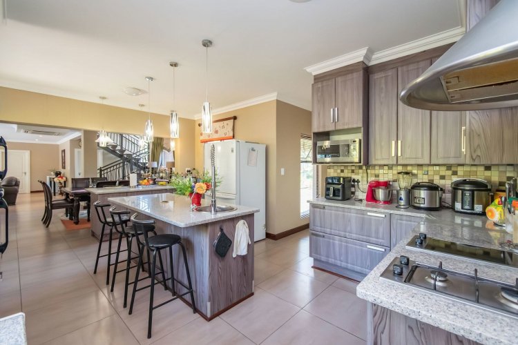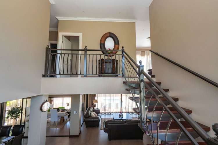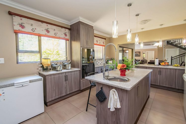 Living spaces are beautifully interconnected, with a private study, a formal lounge, a TV room and a dining room all designed around an impressive open-plan layout. An indoor braai area anchors the entertainment space, making gatherings enjoyable throughout the year. The kitchen is supported by both a scullery and a pantry, and a conveniently located guest toilet adds further practicality and an adjoining gym area that enhances the home's relaxed, family-friendly atmosphere..