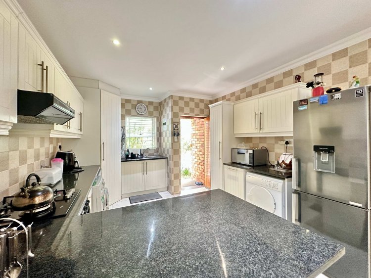 The ground floor offers a modern, well designed kitchen that flows into an open plan dining and lounge area, opening through sliding doors to a covered patio with a built in gas braai and a private pet friendly garden, ideal for holiday guests and entertaining. A downstairs bedroom with a full en-suite bathroom adds flexibility for guests or extended family.