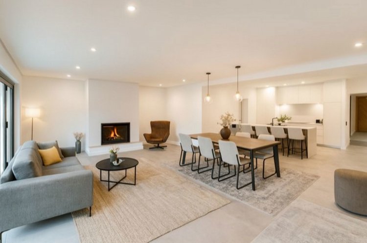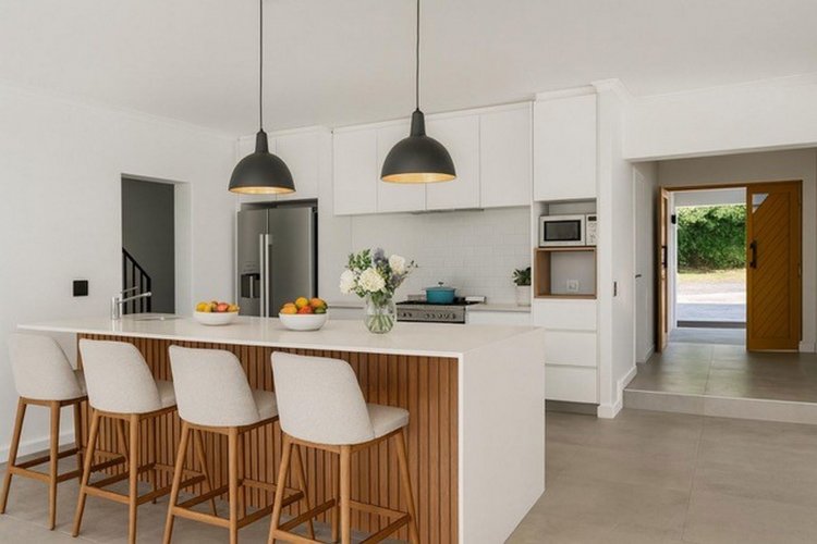 At the heart of the home lies a designer kitchen with an expansive island, a 90cm gas/electric cooker, and sleek modern finishes. The adjoining scullery and laundry connect directly to the double garage, making daily living practical and effortless.