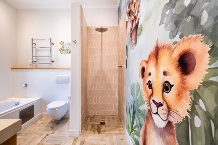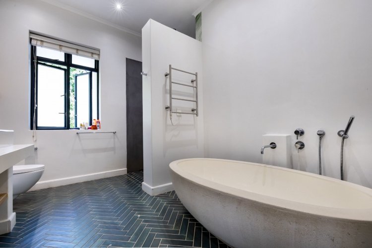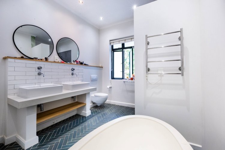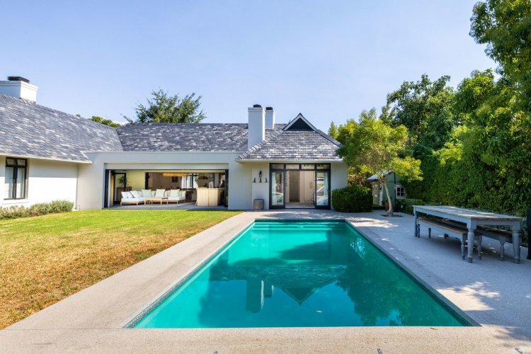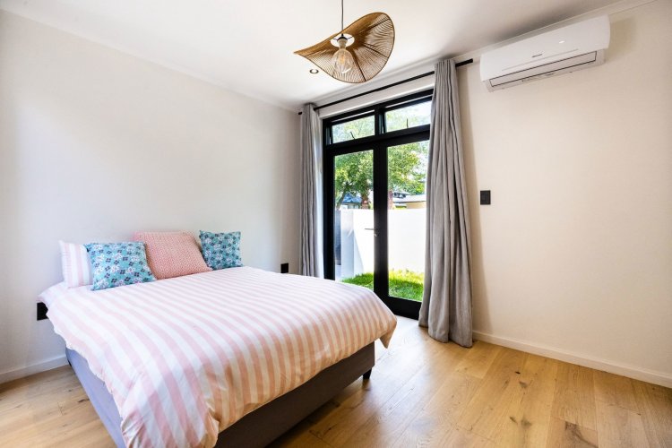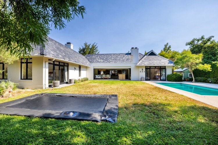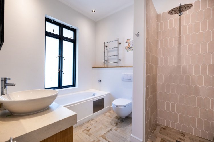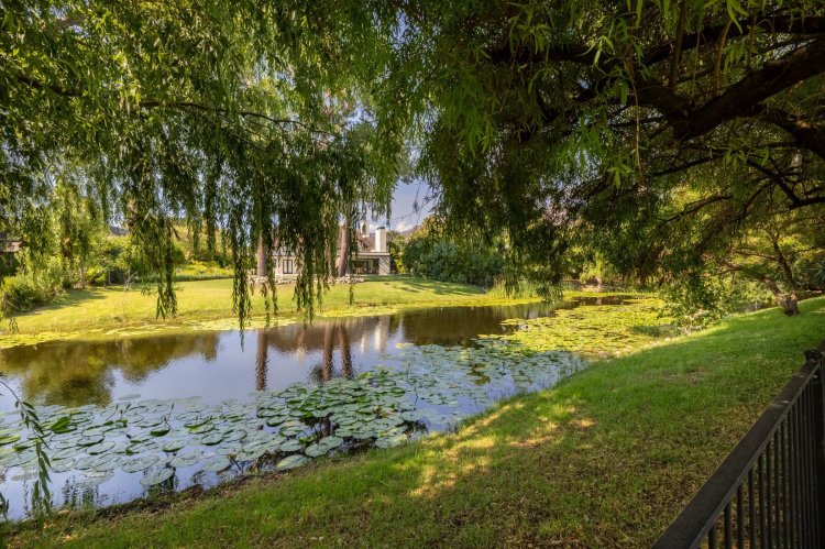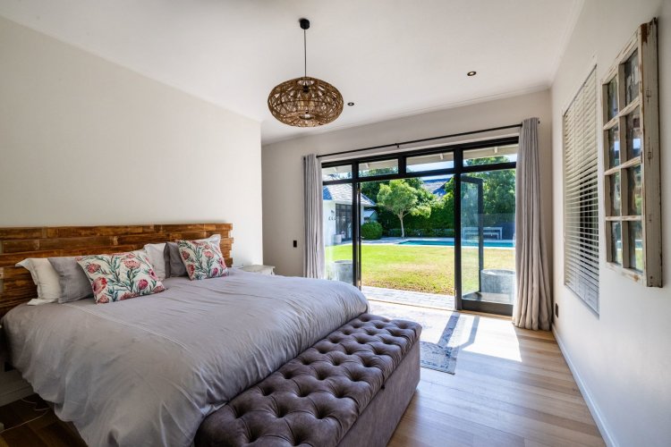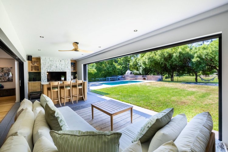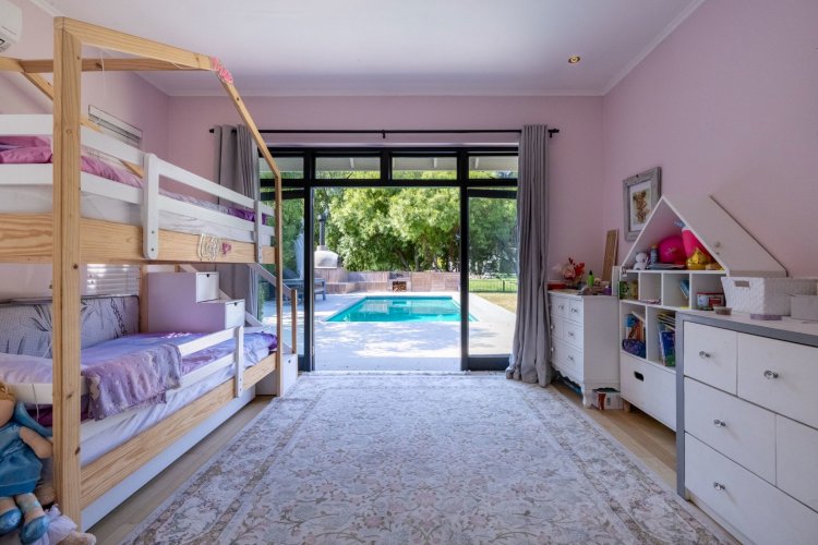 The main living and reception room is generous and welcoming, with well-proportioned ceilings, a feature fireplace, and pocket sliding doors that open fully onto the braai and bar area. From here, the home flows into an established garden that feels remarkably private for an estate setting. A heated swimming pool sits comfortably within the garden, and beyond it lies a tranquil lake, enhancing the sense of openness and calm.